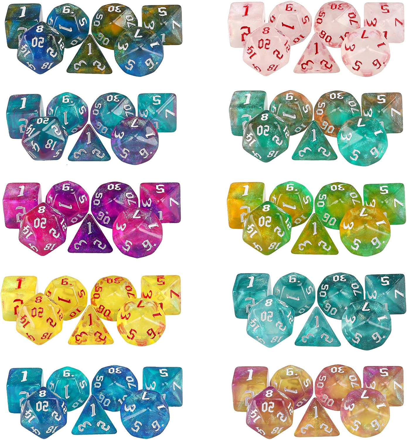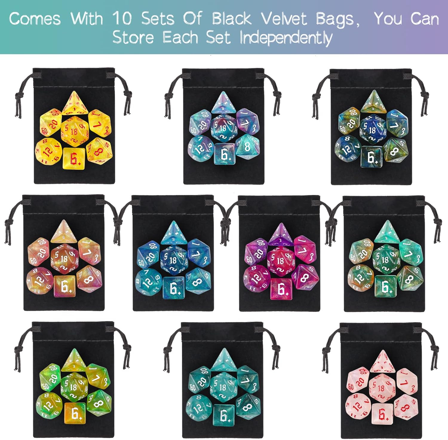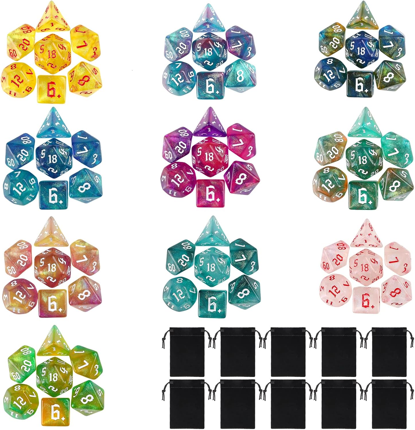 - 【DND DICE SET】: 10 x 7 dice set (70pcs), 10 drawstring bag.Special sickle font, Mixing of 3 colors.All dice have subtle sequin sparkles.