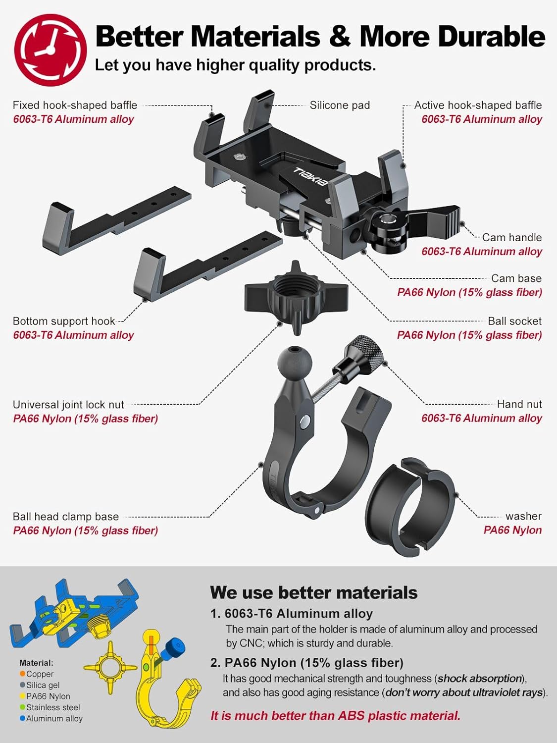 - 【6063 aluminum alloy body+nylon base】The main body of this motorcycle phone holder is made of 6063 aluminum alloy material and processed by CNC machining;Stainless steel screw fittings, which is strong and durable. The support base and spherical universal joint are made of PA66 nylon and 15% glass fiber mixed raw materials injection molded, which makes the base more resilient and can reduce vibration and impact to a certain extent.Compared to plastic and silicone phone holder mounts, it is stronger, has no vibration or noise, and will not fade.