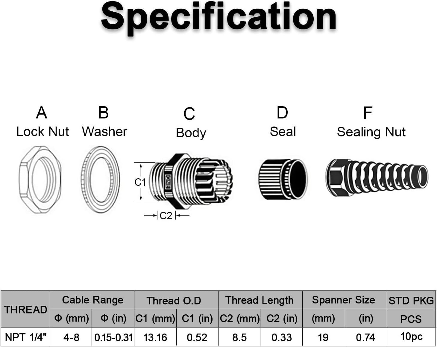 - NPT Gland Thread: Cable glands kit has NPT 1/4" 10 packs in total. Adjustable range strain relief to cables and wires connecting to electrical equipment including junction boxes. Spiral design makes a better protection for wires.