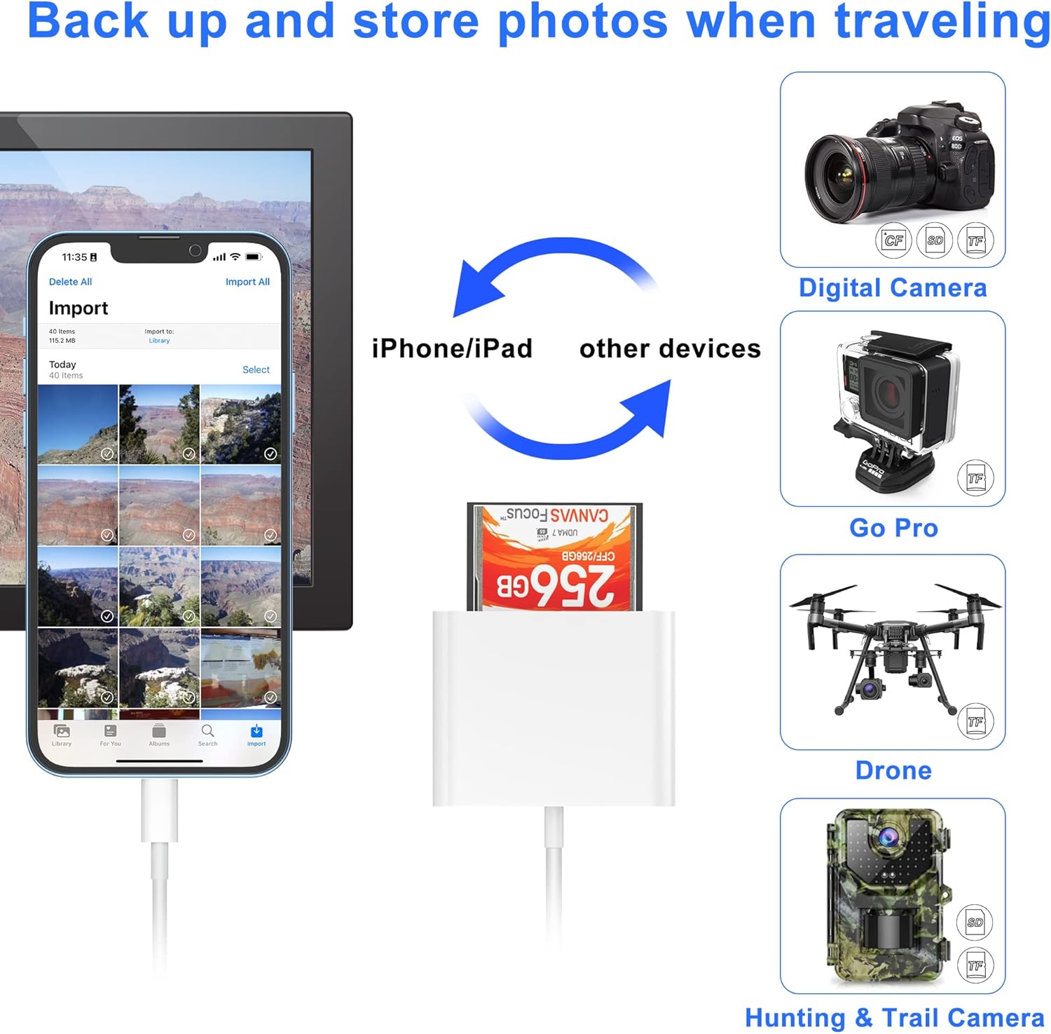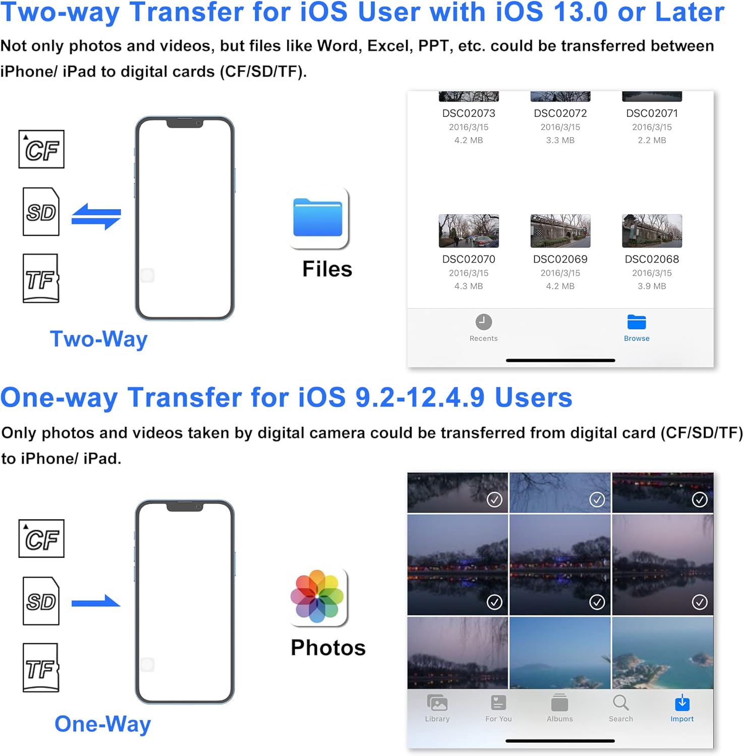 - [Two-way Transfer]: Two-way transfer suitable for iOS 13 -15 device. Import data from SD/TF/CF card to phone/pad, or export the file from phone/pad to SD/TF/CF card. Include Movies, Music, Word, Power point, Excel, PDF, etc.