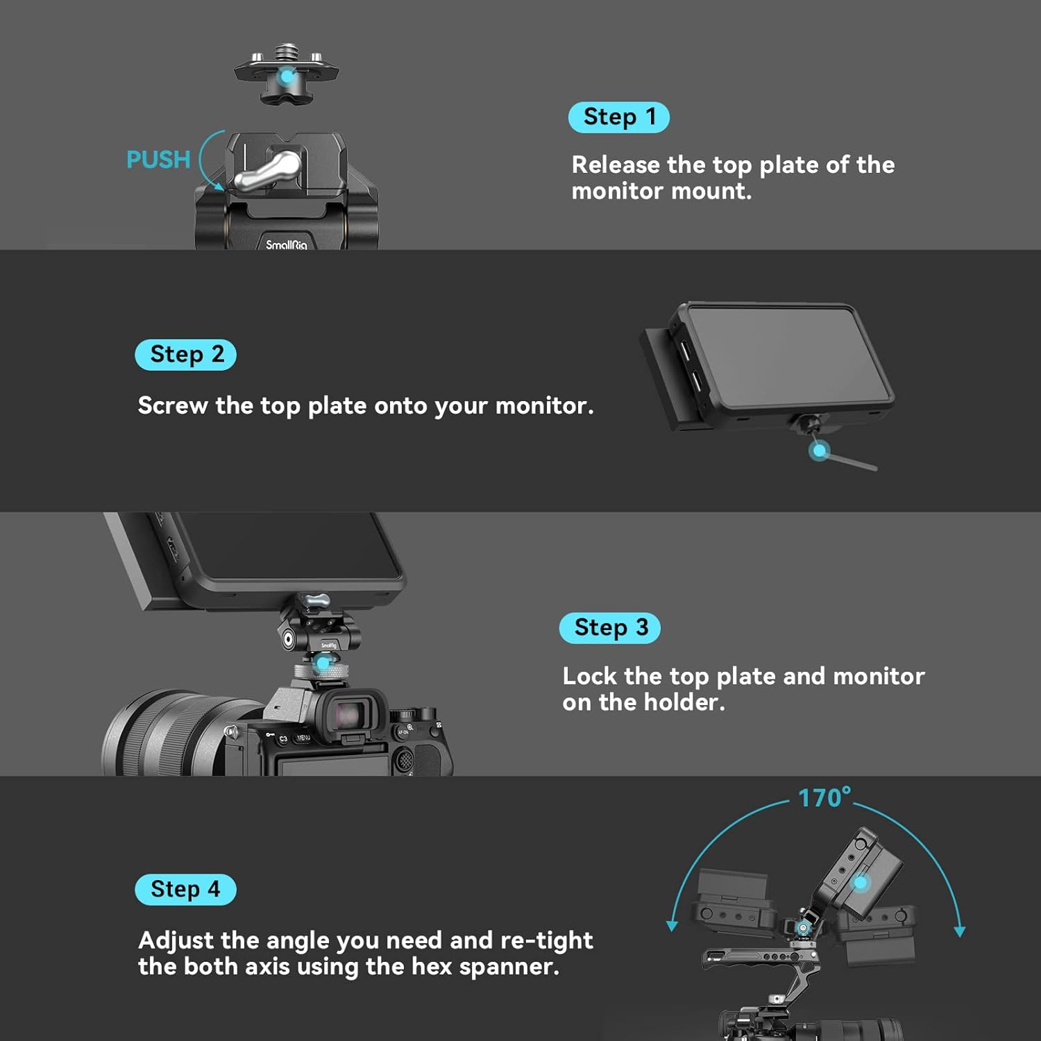 - For 5" or 7" Monitor: SmallRig monitor mount 3514C is designed to hold your monitor onto the top of the camera or other mounting system via cold shoe adapter. It features 1/4"-20 screw on the top for monitor, light, or microphone, and the quick release plate is reserved for 2 optional dowel pins, which can be removed and installed as needed to effectively prevent the devices from deflection