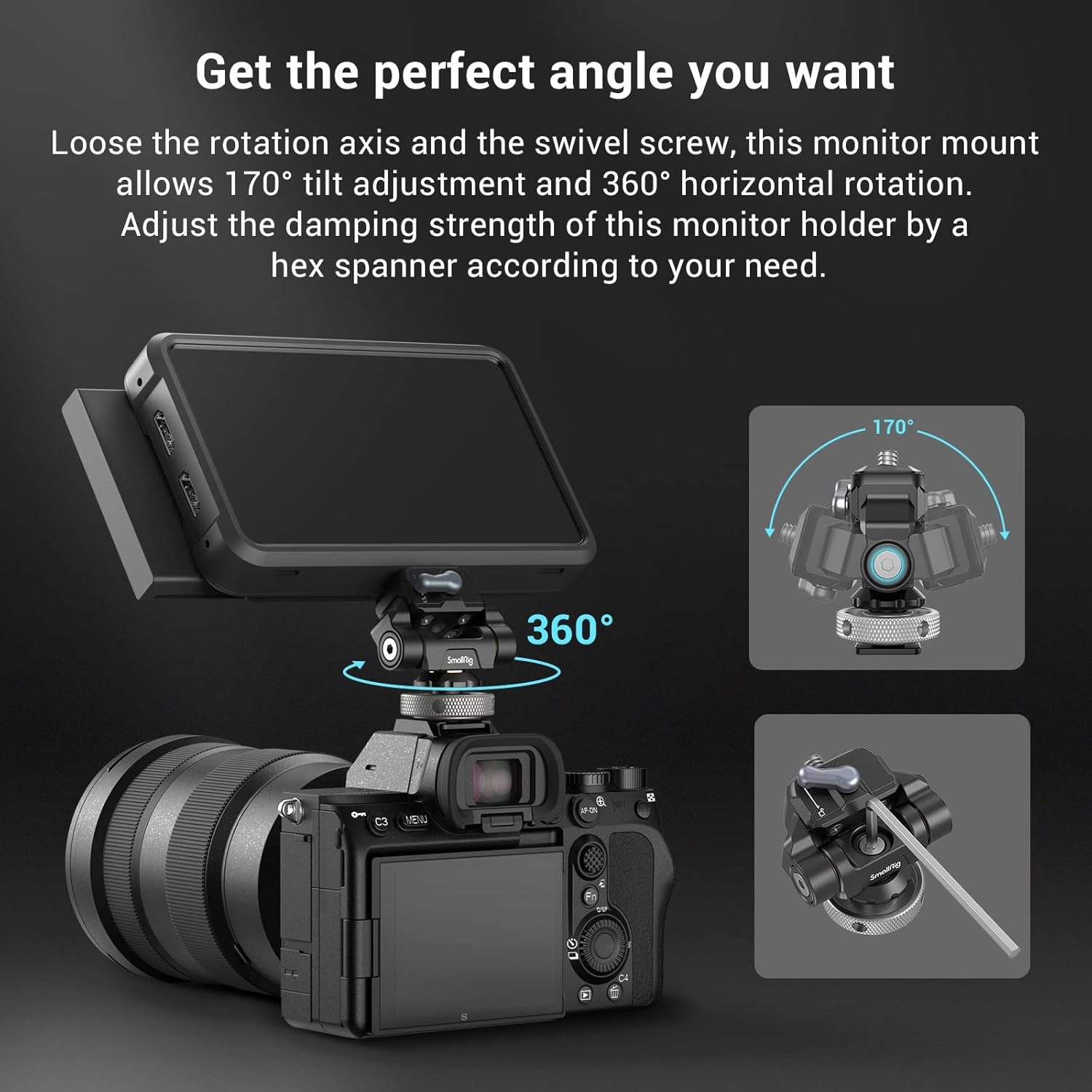 - 360° Swivel & 170° Tilt: The camera monitor holder enables to swivel 360° sideways and tilt 170° with free-stop in any positions and angles you preferred. It enables the cameraman to have better monitoring as per the needs in different shooting scenarios. Besides, its damping of pivot is adjustable through spanner