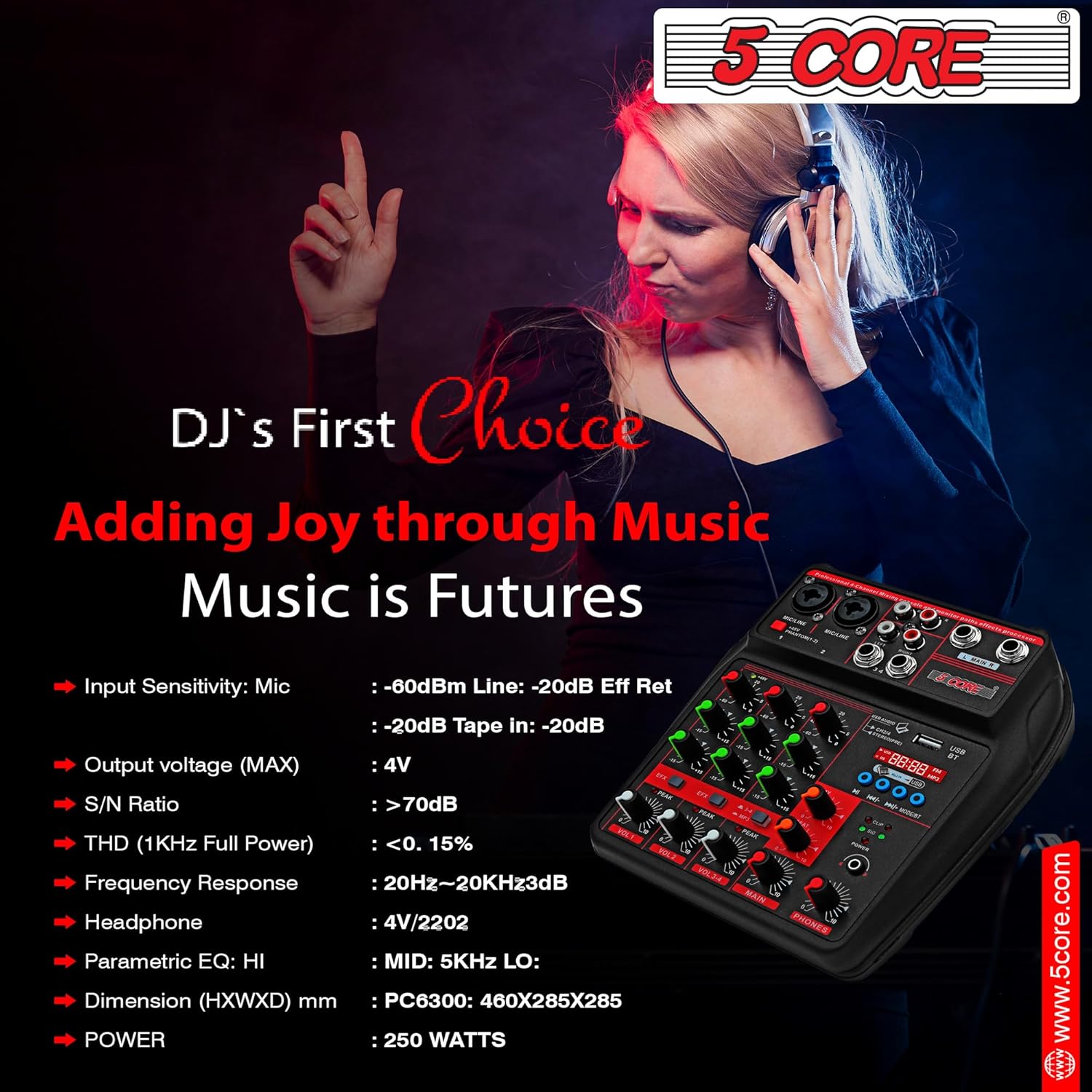 5 Core Audio Mixer 4 Channel DJ Mixing Board Small Bluetooth USB Analog Mezclador De Audio w Phantom Power Console for Live Recording Podcast Karaoke PARENT MX 4CH (Black)