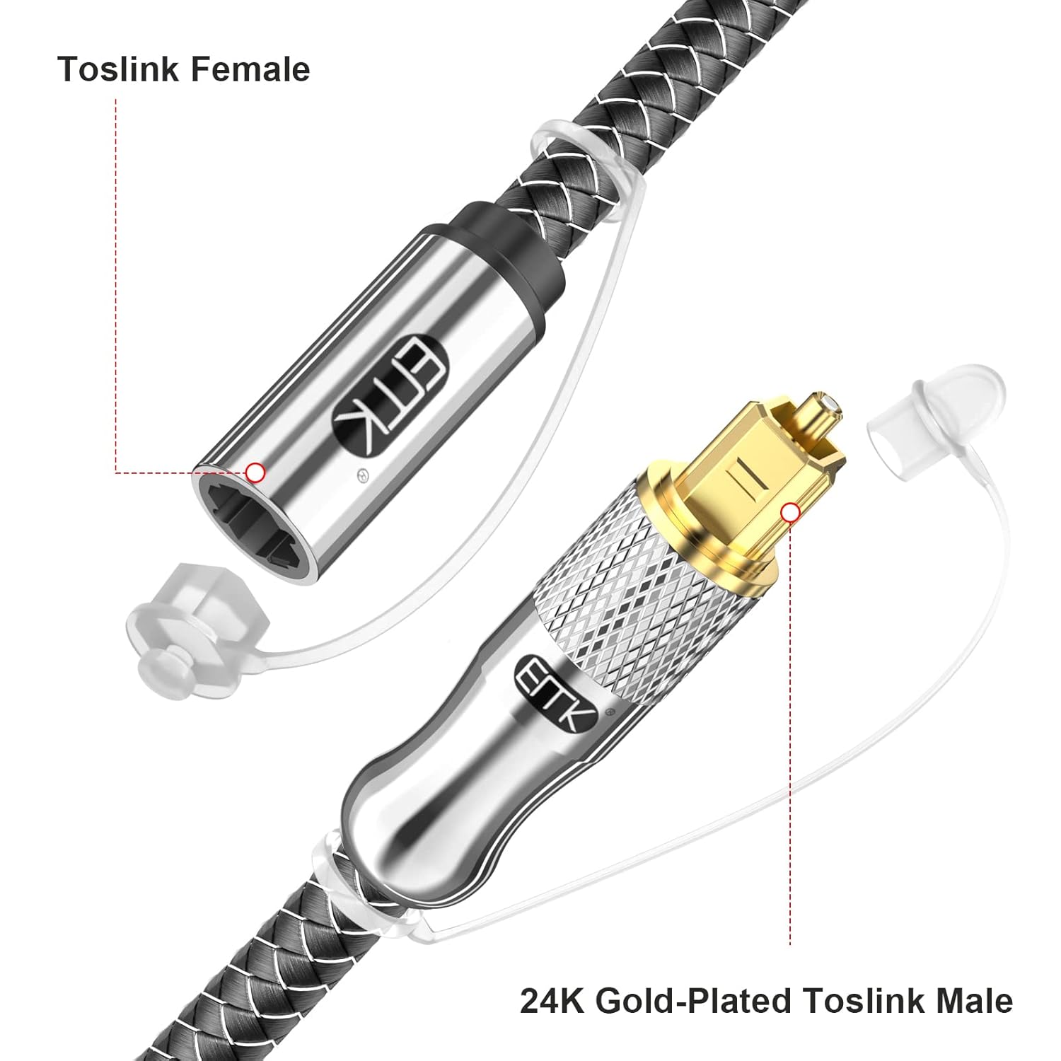 - EMK Female to Male 24K Gold-Plated Optical Cable Extension: EMK Toslink male to female adapter extends the connection between your TVs, Blu-ray players, or any other (TOSLINK/OPTICAL) port equipped devices to your soundbar, amplifier, speaker, or home theater system, etc.