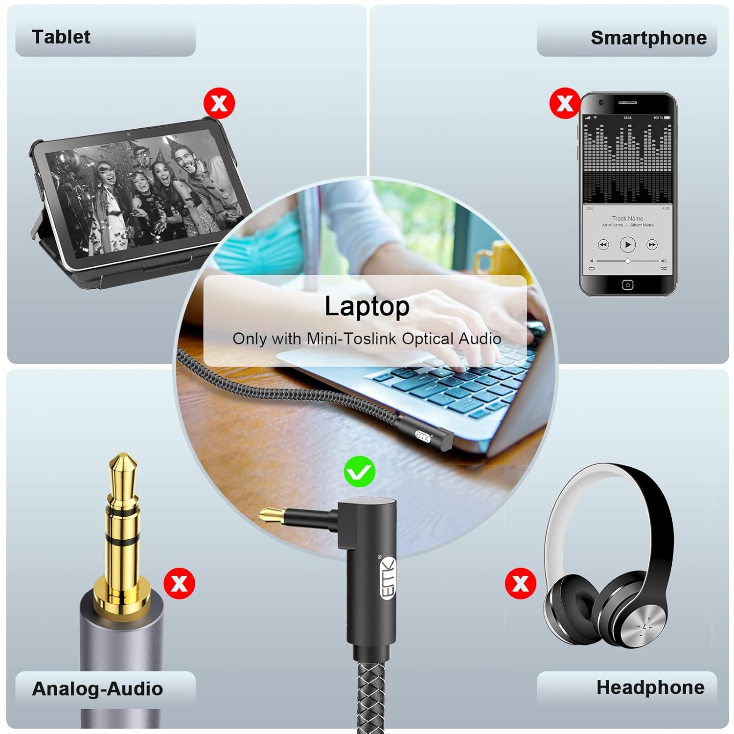 - Important Note: EMK's Mini Toslink cable is designed exclusively for digital optical audio transmission - it cannot perform analog-digital signal conversion. This means: ✖ No analog output - Won't work with standard 3.5mm headphone jacks ✖ No signal conversion - Not compatible with analog-to-digital adapters ✔ Pure digital use only - For devices with Toslink (optical) ports