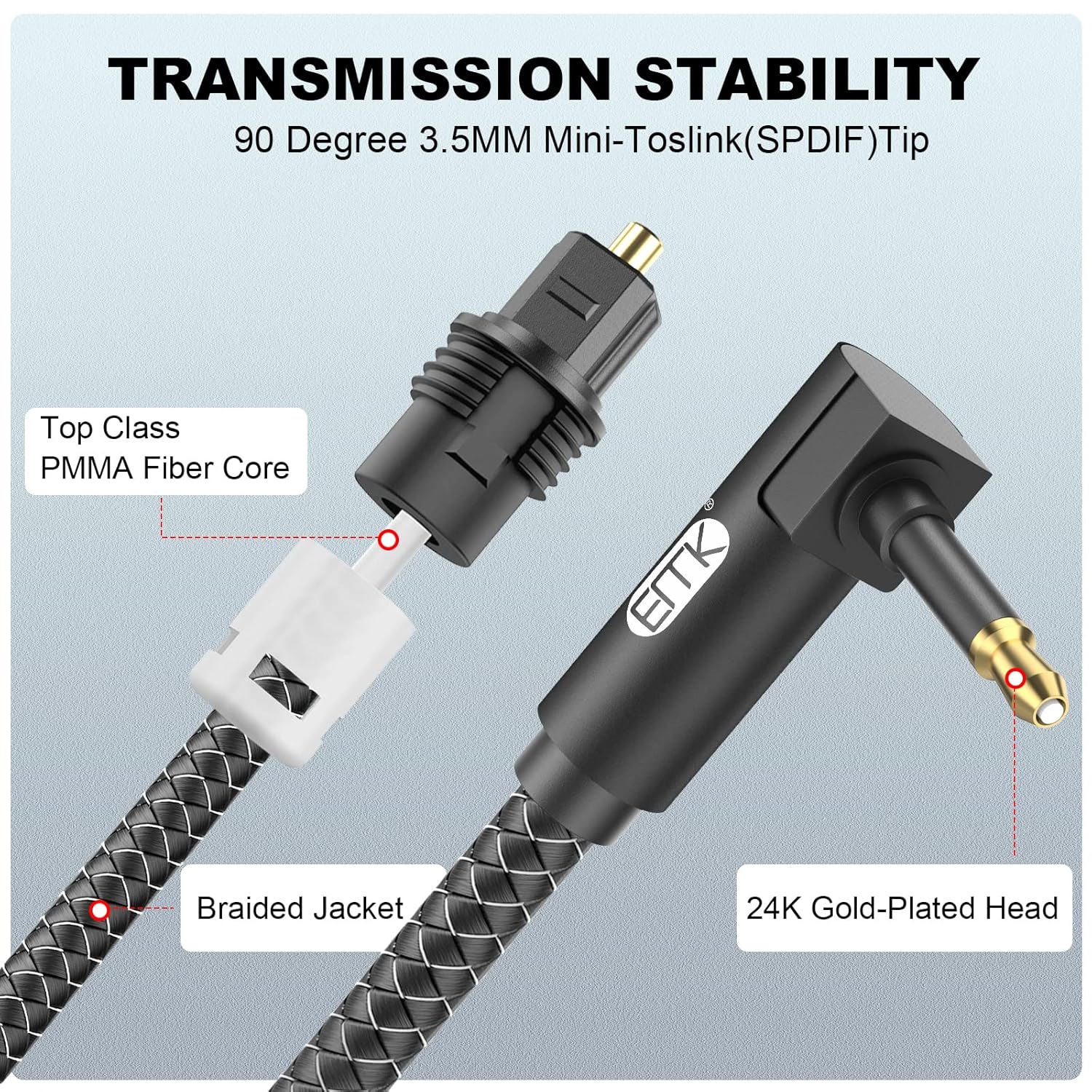 - Engineered for audiophile-grade performance, EMK's 90° Mini Toslink cable features 24K gold-plated connectors and precision-polished fiber optics to deliver zero signal loss, pristine digital audio transmission, and unparalleled sonic accuracy for your home theater or studio setup.