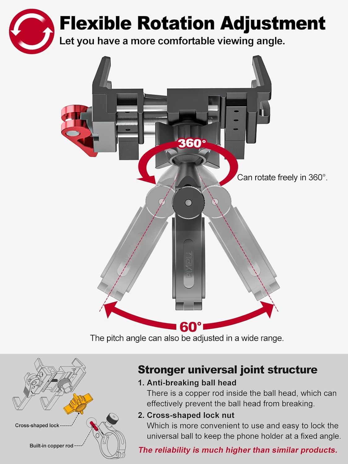 - 【Lock in 1 second, no tools required】 Exquisite structure, easy to use. No tools required, with a quick release button on the right side, it only takes 1 second to install or remove the phone. Compared with the traditional motorcycle phone holder, this aluminum cell phone holder saves 90% of the time. The metal swivel mechanism is firm and reliable, with spherical shape universal joint, which can rotate 360°, you can freely adjust the viewing angle.