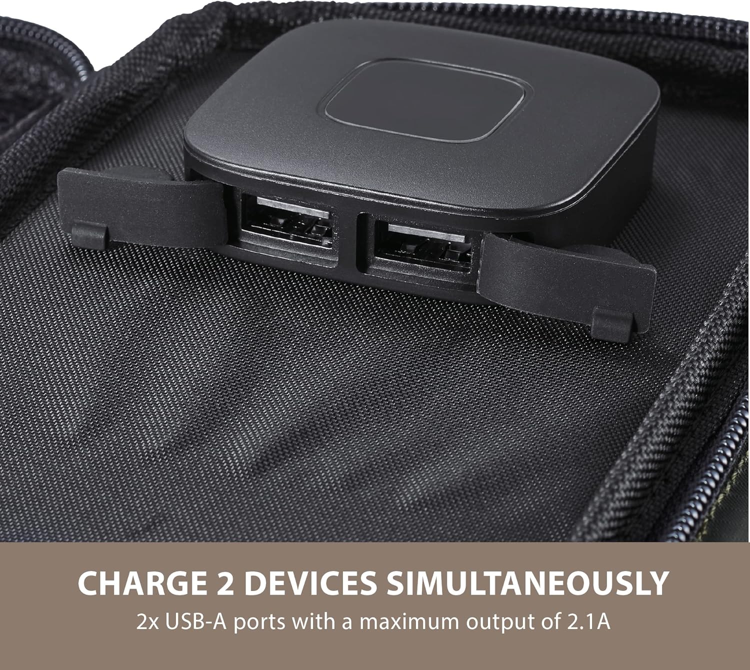 - ADJUSTABLE STANDS - Find the best angle to catch the sun with 2 built-in adjustable stands..DURABLE WATER-RESISTANT NYLON - The bag is made of a durable ripstop nylon that is water-resistant to handle daily use with ease..STORAGE BAG WITH POUCHES - The bag has two mesh storage pouches to store electronic cables or small items like carabiners..EXTERIOR HOOKS - There are three loops on the exterior of the bag for the added convenience of hanging from trees, tents, or cables..