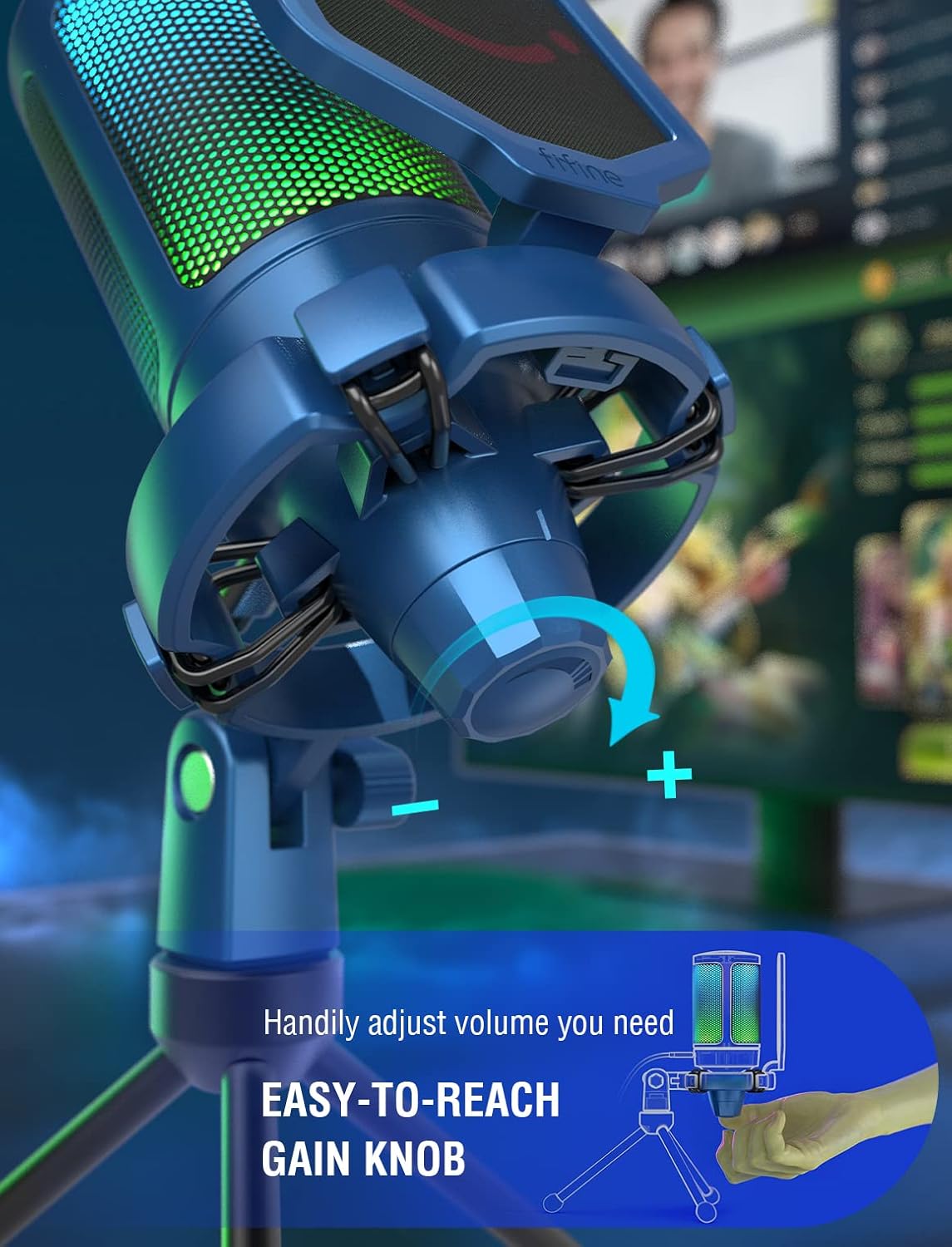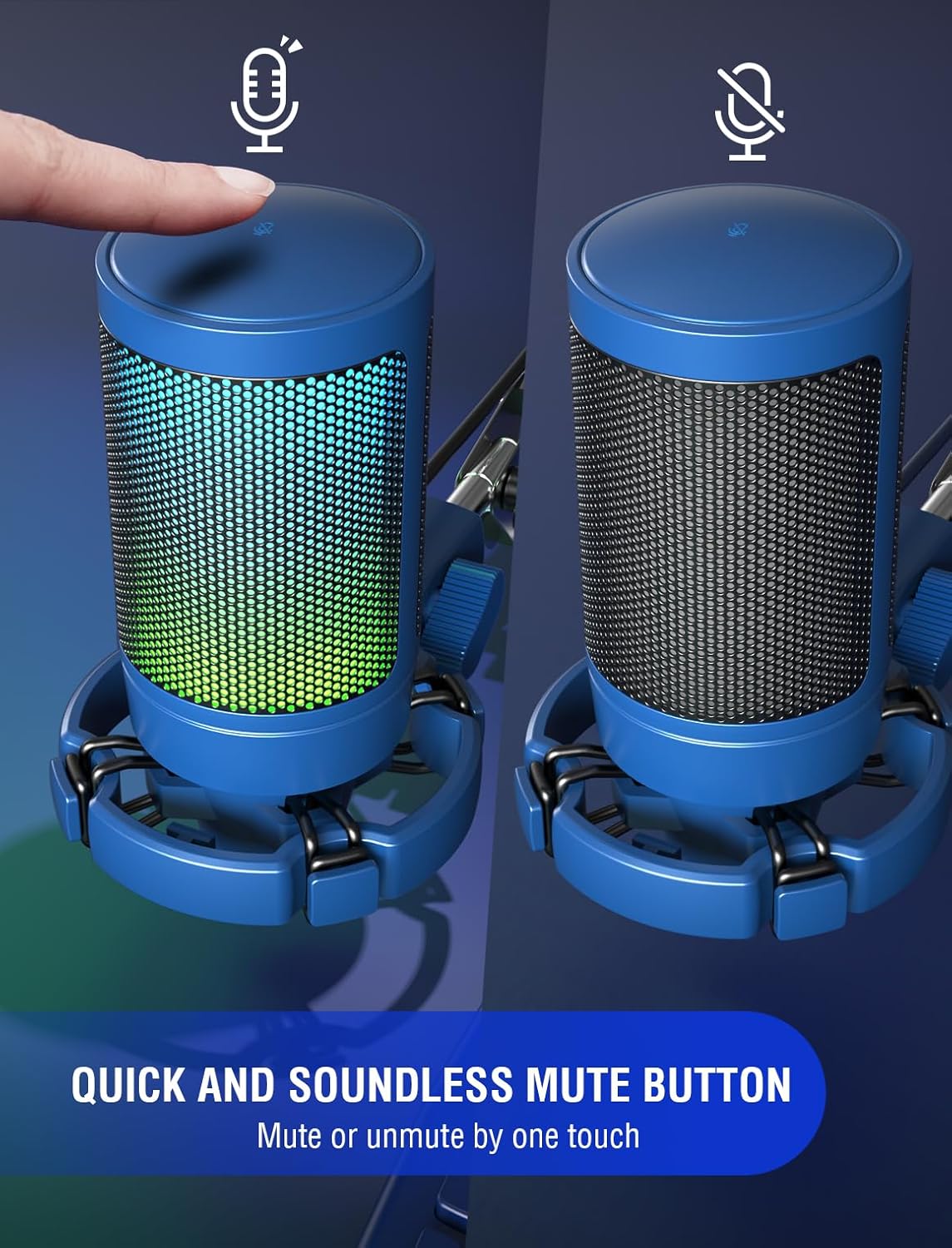 - Vivid RGB & Quick Mute-Polished blue gaming mic body with automatic changing RGB, matching flowing rainbow light computer build, shows your calm and luxury of gamer device. Touch the mute button on the top to quickly mute, and the RGB will be turned off following it, reminding you of working status.
