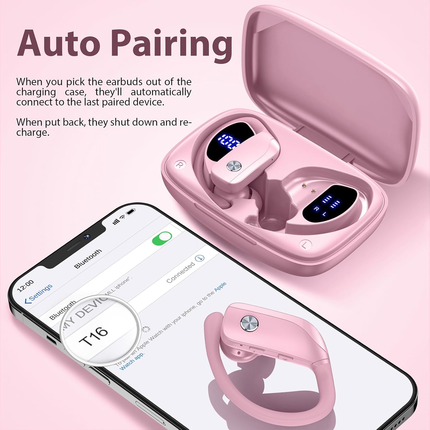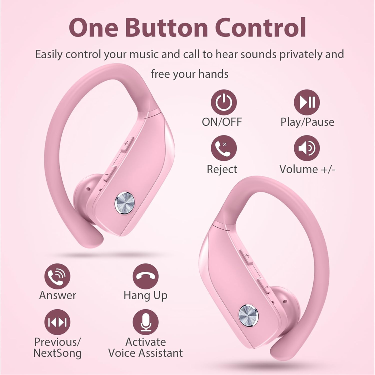bmanl Wireless Earbuds Bluetooth Headphones 48hrs Play Back Sport Earphones with LED Display Over-Ear Buds with Earhooks Built-in Mic Headset for Workout Pink