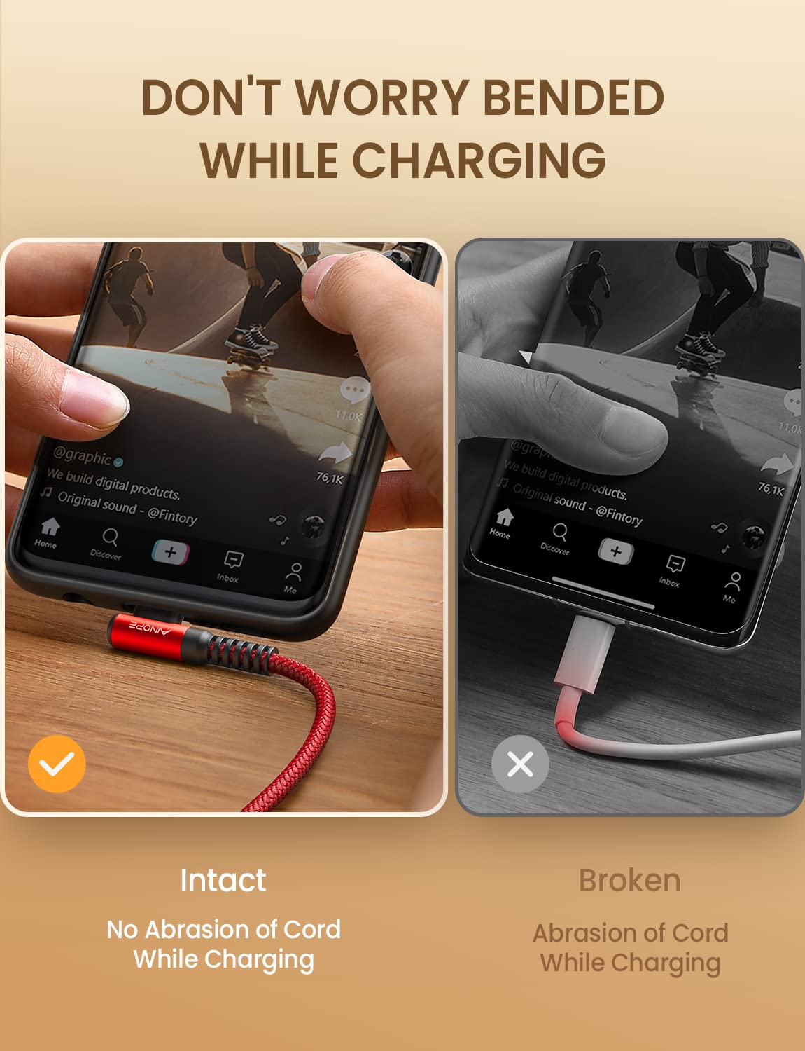 - [Upgraded Exclusive Right Angle Design]: When you use this 90-degree right angle elbow USB C Cable to charge your phone, you'll find that your fingers can tap the phone so naturally to play games and watch movies without hindrance, and your hand can perfectly hold the bottom to scroll the phone screen.