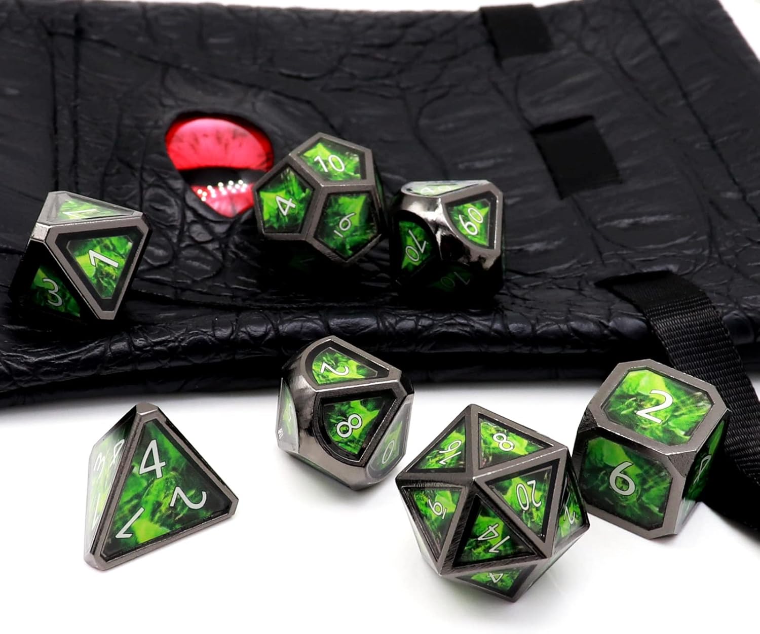 Haxtec Metal Dice Set D&D Acid Splash Real Scene Black Green Polyhedral DND Dice W/PU Leather Dragon Eye Dice Bag for TTRPG Compatible with Dungeons and Dragons Gifts