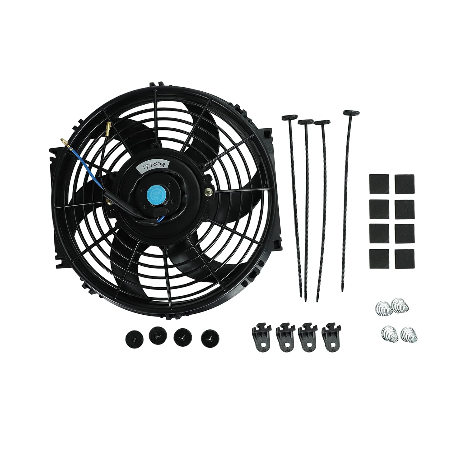 - HIGH-PERFORMANCE: 2PCS 12V 80W 10 Inch radiator engine cooling fan with mount brackets and tie straps kit. Maximum Fan CFM: 800 CFM. Maximum Fan RPM: 2400±10% RPM.Thickness=2.5". Number of Blades: 6