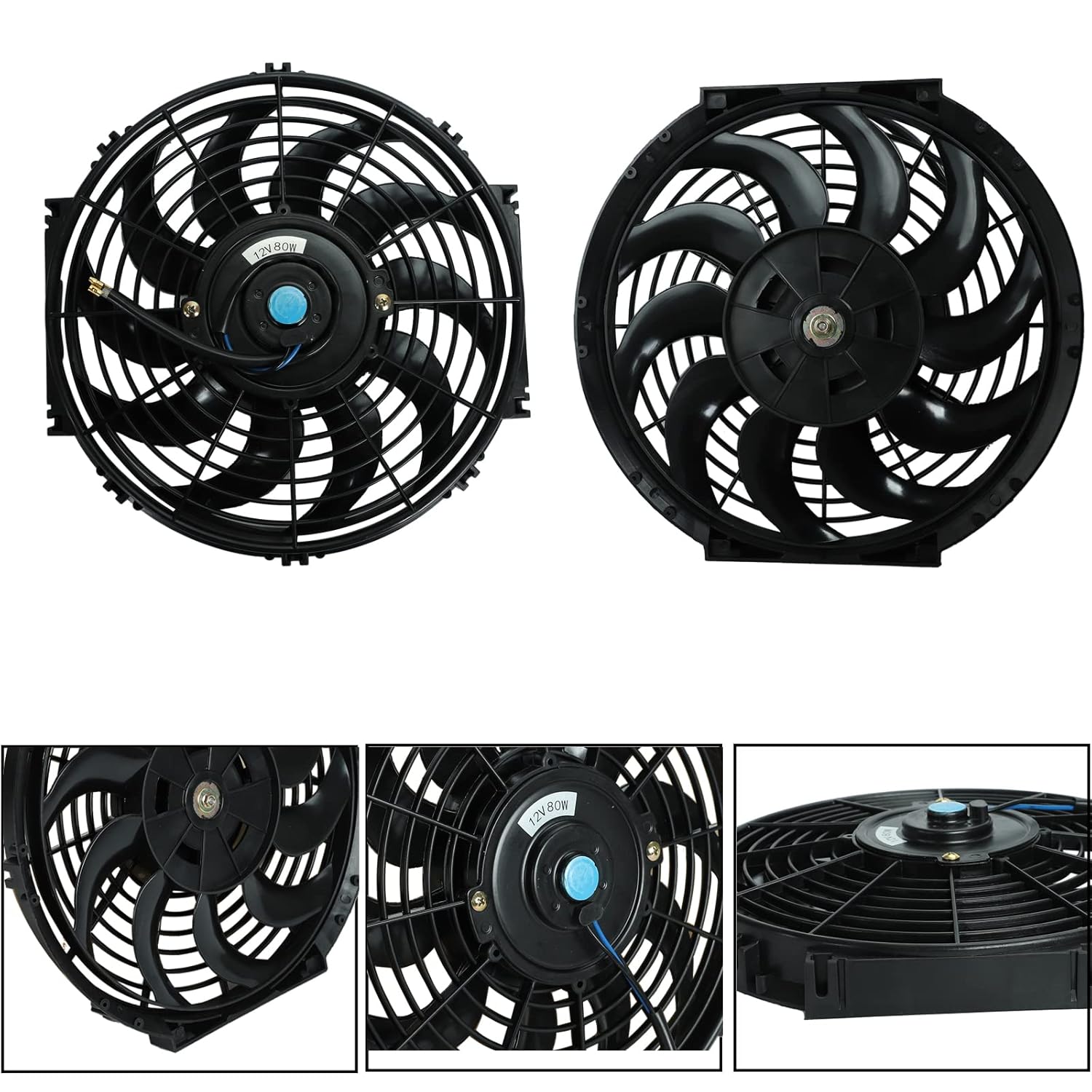 - HIGH-PERFORMANCE: 2PCS 12V 80W 12 Inch radiator engine cooling fan with mount brackets and tie straps kit.Maximum Fan CFM=1730 CFM, Maximum Fan RPM=2250 RPM. Fan Diameter (in): 12.050”. Thickness (in): 2.500”. Number of Blades: 10