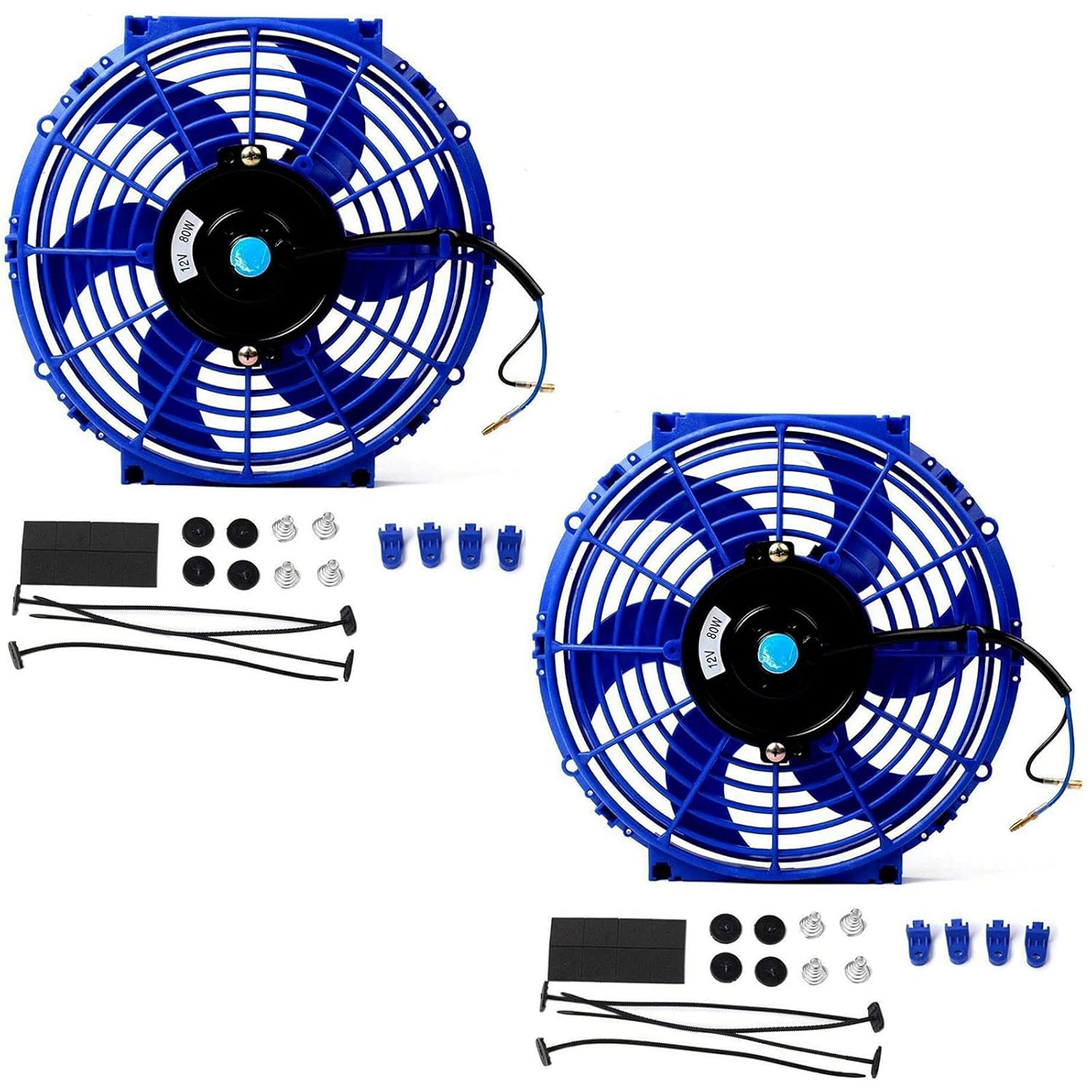 - HIGH-PERFORMANCE: 2PCS 12V 80W 10 Inch radiator engine cooling fan with mount brackets and tie straps kit. Maximum Fan RPM=1730 RPM. Thickness=2.5". Number of Blades: 6