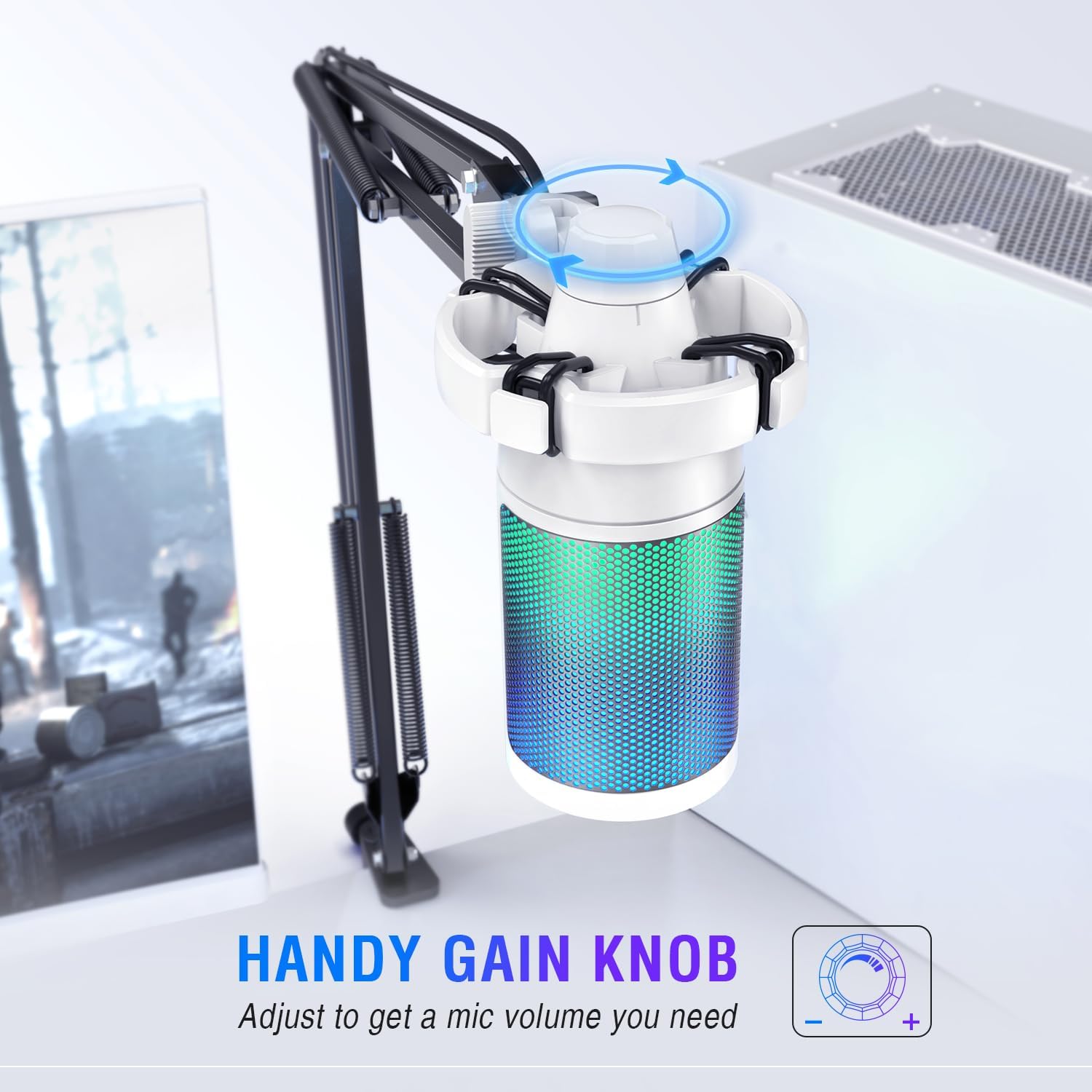 - HANDY-You can adjust the volume knob on streaming mic body according to your teammates’ or audience’ feedback. Clear and effective communication speeds up the progress of unlocking game tasks. Gaming PC microphone featured with mute function that works with RGB for clear working state reminding. When RGB is off, the computer mic mute.
