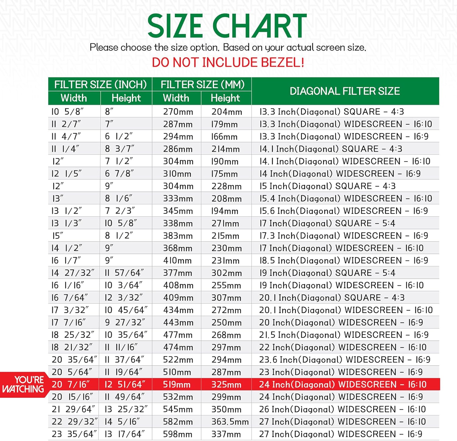 - ☘️ FILTER DIMENSIONS - Width: 20 7/16" (519 mm), Height: 12 51/64" (325 mm), Diagonal: 24"W ANBAC ATTACHMENT TYPE PRIVACY SCREEN FILTER is compatible with all major brands such as HP, Dell, Samsung, Lenovo, LG, Acer, ASUS, ViewSonic, and the others. Please check your screen's width and height measurement in order to purchase the right filter for your screen size. (We advise that you DO NOT DECIDE your order only based on your screen’s diagonal size).