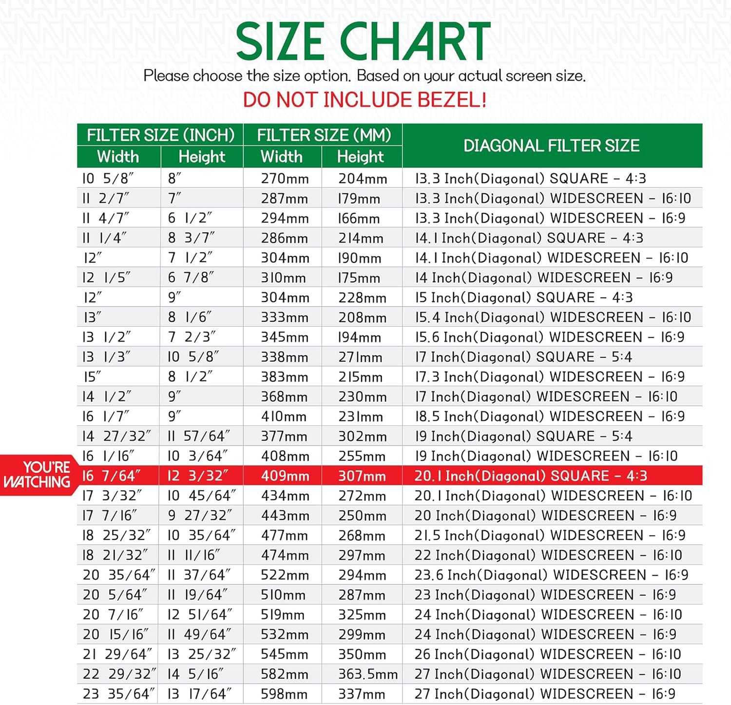 - ☘️ FILTER DIMENSIONS - Width: 16 7/64" (409 mm), Height: 12 3/32" (307 mm), Diagonal: 20.1" ANBAC ATTACHMENT TYPE PRIVACY SCREEN FILTER is compatible with all major brands such as HP, Dell, Samsung, Lenovo, LG, Acer, ASUS, ViewSonic, and the others. Please check your screen's width and height measurement in order to purchase the right filter for your screen size. (We advise that you DO NOT DECIDE your order only based on your screen’s diagonal size).