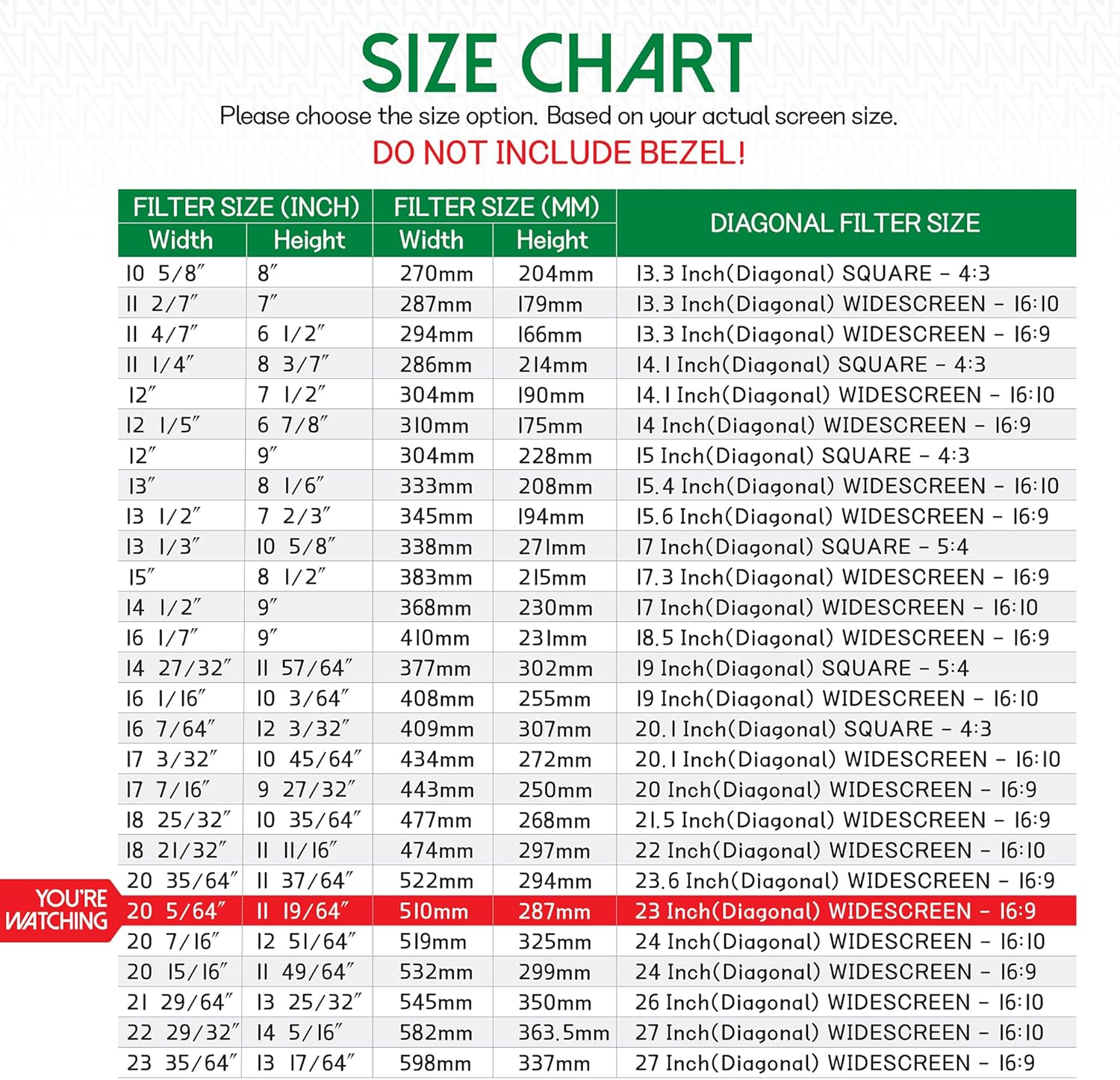 - ☘️ FILTER DIMENSIONS - Width: 20 5/64" (510 mm), Height: 11 19/64" (287 mm), Diagonal: 23"W9 ANBAC ATTACHMENT TYPE PRIVACY SCREEN FILTER is compatible with all major brands such as HP, Dell, Samsung, Lenovo, LG, Acer, ASUS, ViewSonic, and the others. Please check your screen's width and height measurement in order to purchase the right filter for your screen size. (We advise that you DO NOT DECIDE your order only based on your screen’s diagonal size).