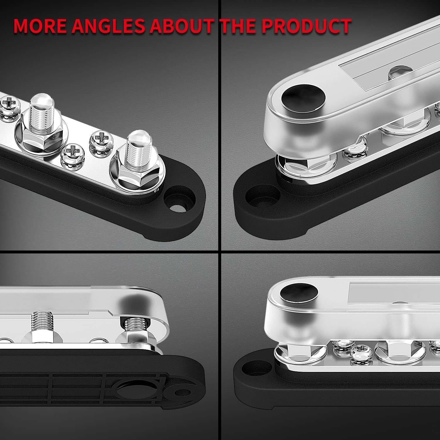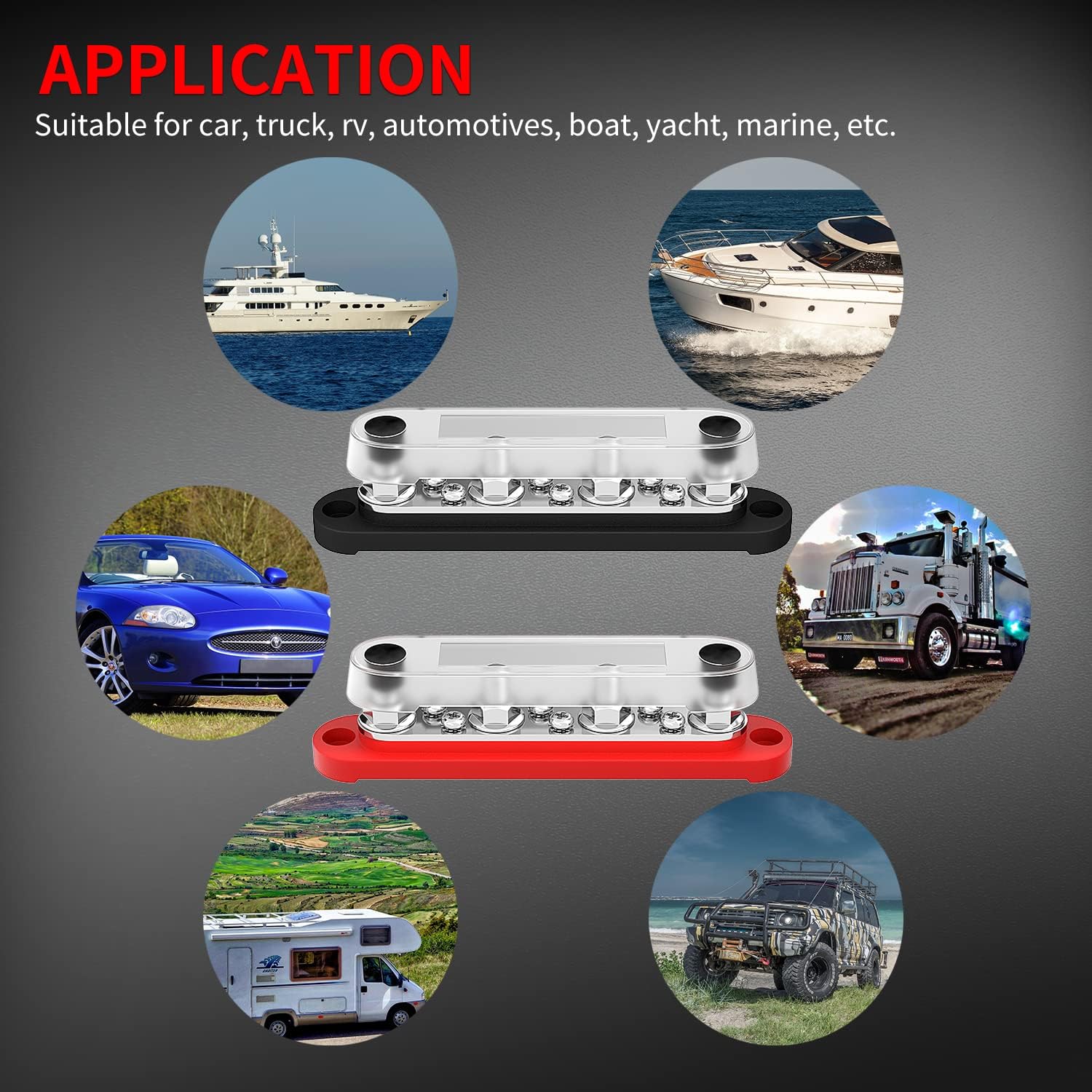 - Application: This battery terminal block uses copper plates and stainless steel terminals as conductors, which enables the battery distribution block to work in extreme environment, suitable for automotive, car, marine, boat, etc.