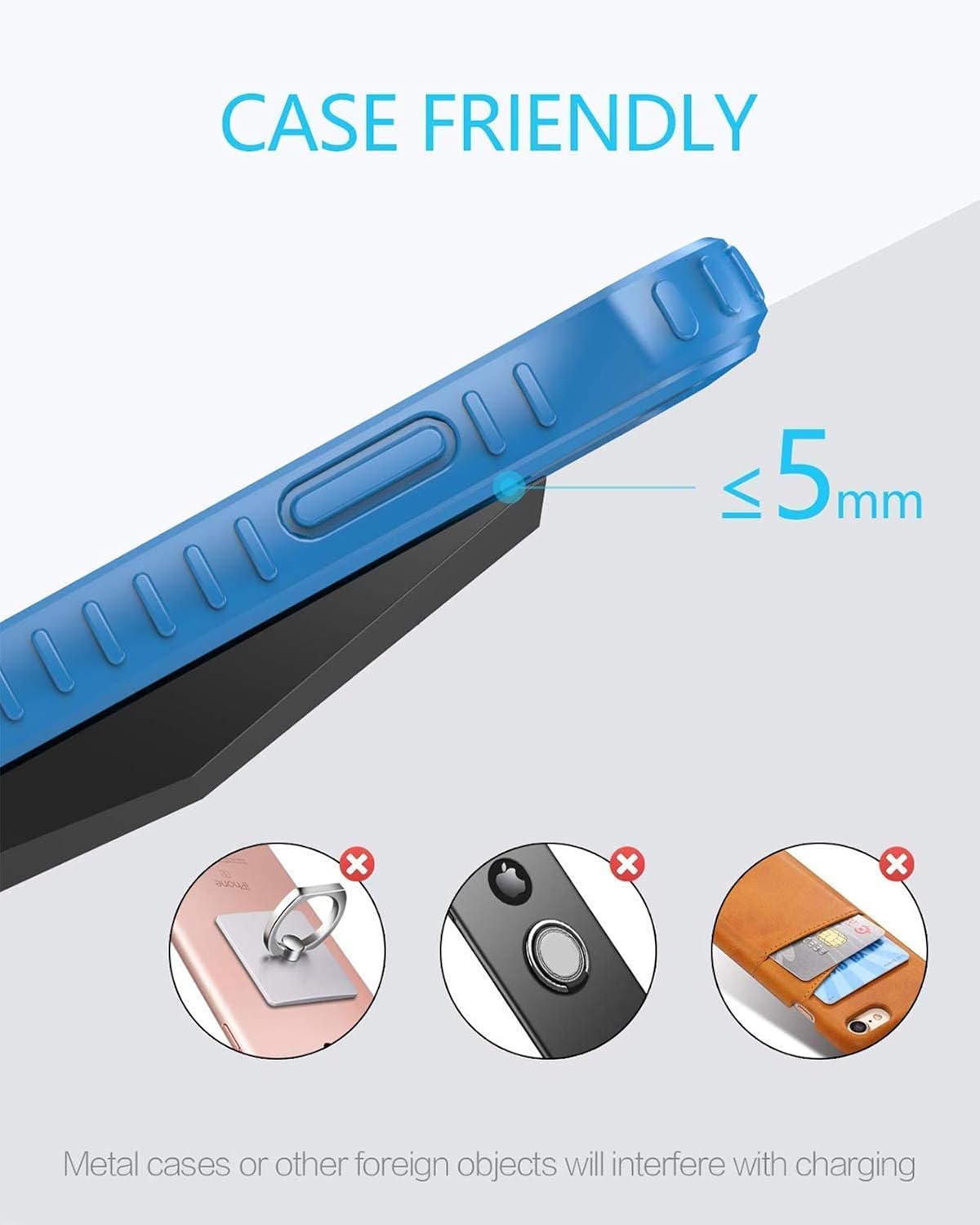 - [Safe Charging Protection] - Featuring over charging and over temperature protection never overcharges your battery or wastes energy. With four anti-slip rubber feet at the bottom to ensure stability. (Supports most phone cases not thick than 5mm such as armor case, rubber case, hybrid case, plastic/TPU/PC cases).Please Remove any metal and magnetic attachment or credit cards before placing your phone