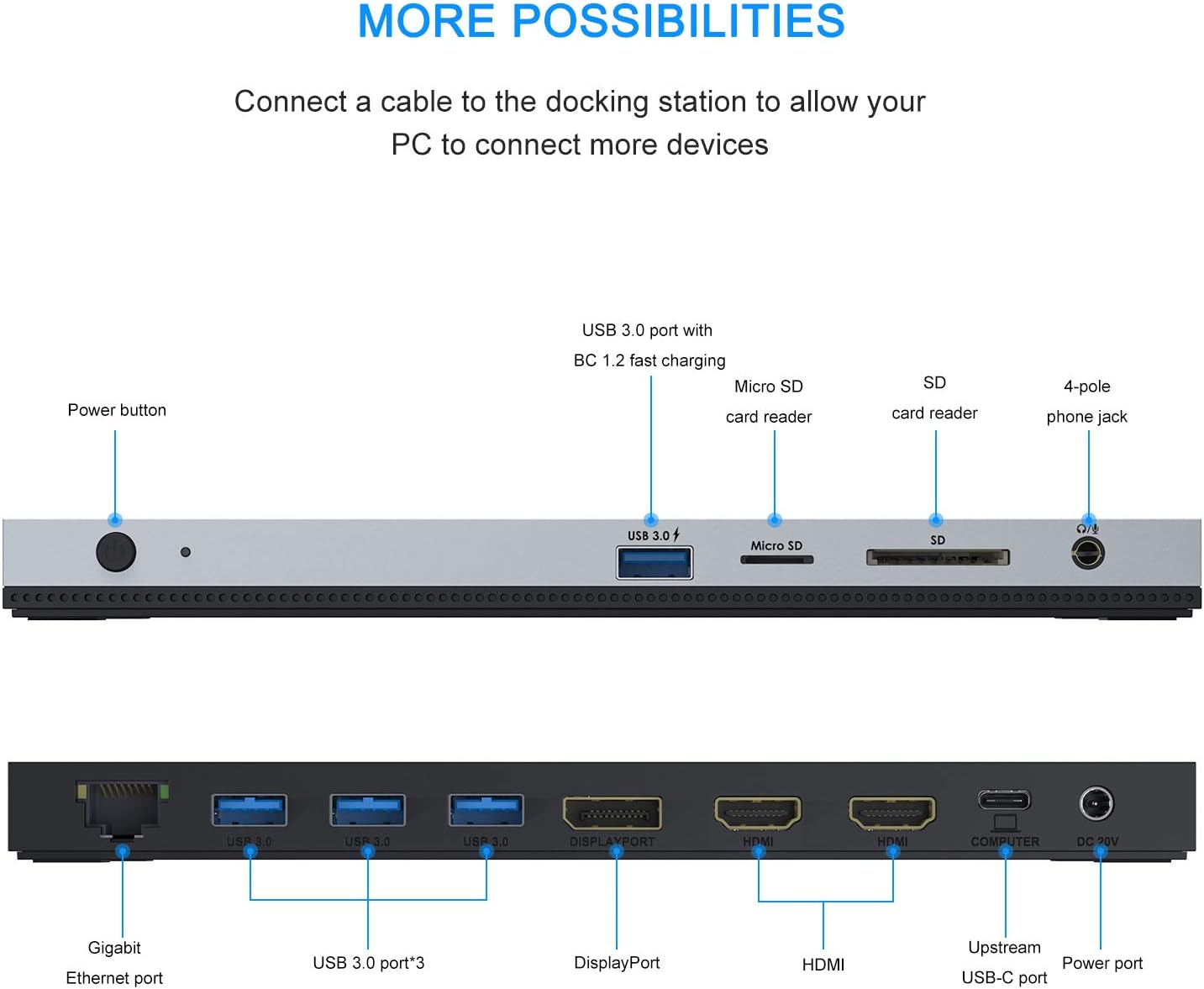 - 4 USB ports & Ethernet & SD/TF card reader - 3 USB 3.0 ports, synchronize data at speeds up to 5Gbps, up to 10x faster than USB 2.0, another BC 1.2 fast charging USB 3.0 port not only transfers data but also helps you charge your phone quickly. 1000Mbps Gigabit Ethernet port provides a stable and faster wired network connection for your file transfer. Built in SD and Micro SD slots for easy access to files from universal SD and Micro SD Memory Card up to 2TB