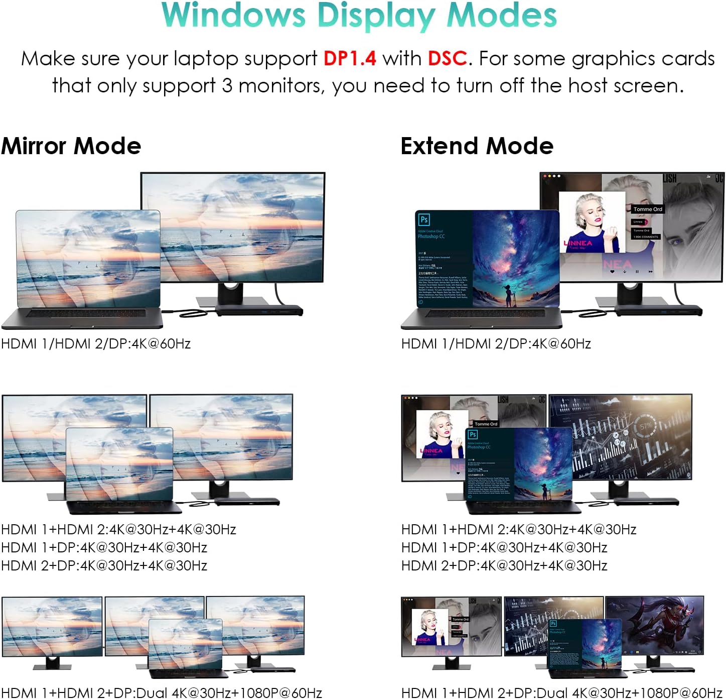 - 4K Ultra HD Triple Display - Dual HDMI and 1 DisplayPort video ports for various needs. The host computer under HBR3 DP1.4 source, a single port video output resolution up to 3840x2160@60Hz, dual displays up to 2560x1440@60Hz, triple displays up to 1920x1080@60Hz. Under HBR3 DP1.2, a single display resolution up to 3840x2160@30Hz or 2560x1440@60Hz, dual display resolution up to 1920*1080@60Hz, triple display up to 1600*900@60Hz