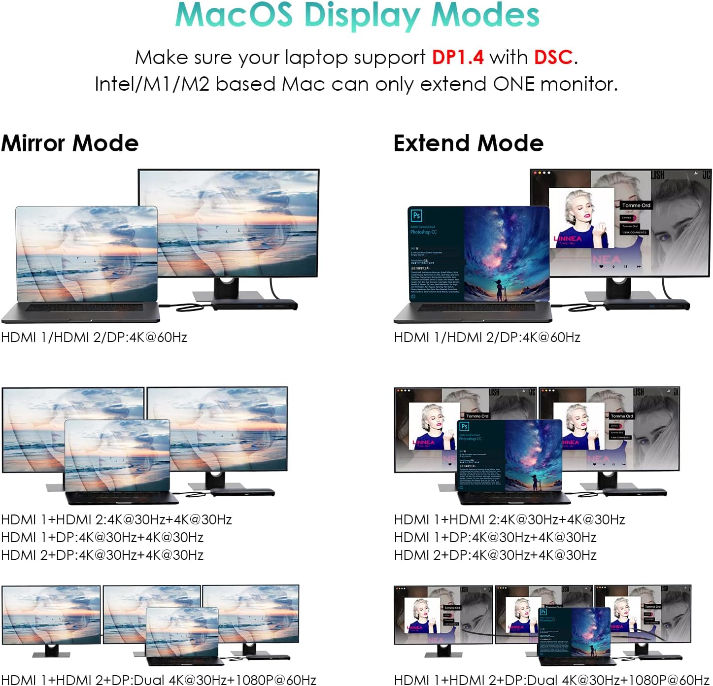 - Tips on laptops system - Mirror or extend your screen directly stream UHD video to HDTV, monitors, projectors. Windows system support MST and SST, triple display. Mac OS only support mirror mode and non-mirror mode without triple display. Non-mirror mode means that the two or three external monitors are same but different from laptop. Intel/M1/M2 based Mac only extend one monitor, the external monitors will show the same content. USB C to Dual HDMI DisplayPort mini dock, Plug and Play