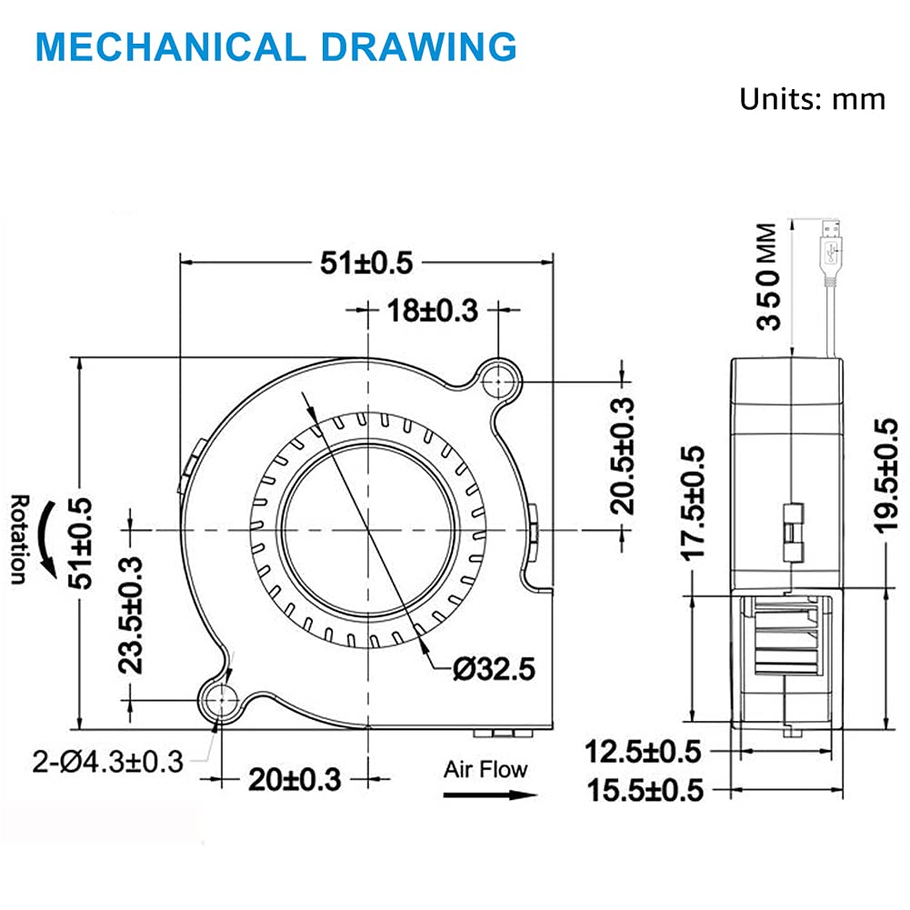 - Easy to Install: Blower Size: 50mm L x 50mm W x15mm H; Air Intake Size: 32.5mm; Air Outlet Size: 19.5x15mm; Mounting Spacing: 2.24 in