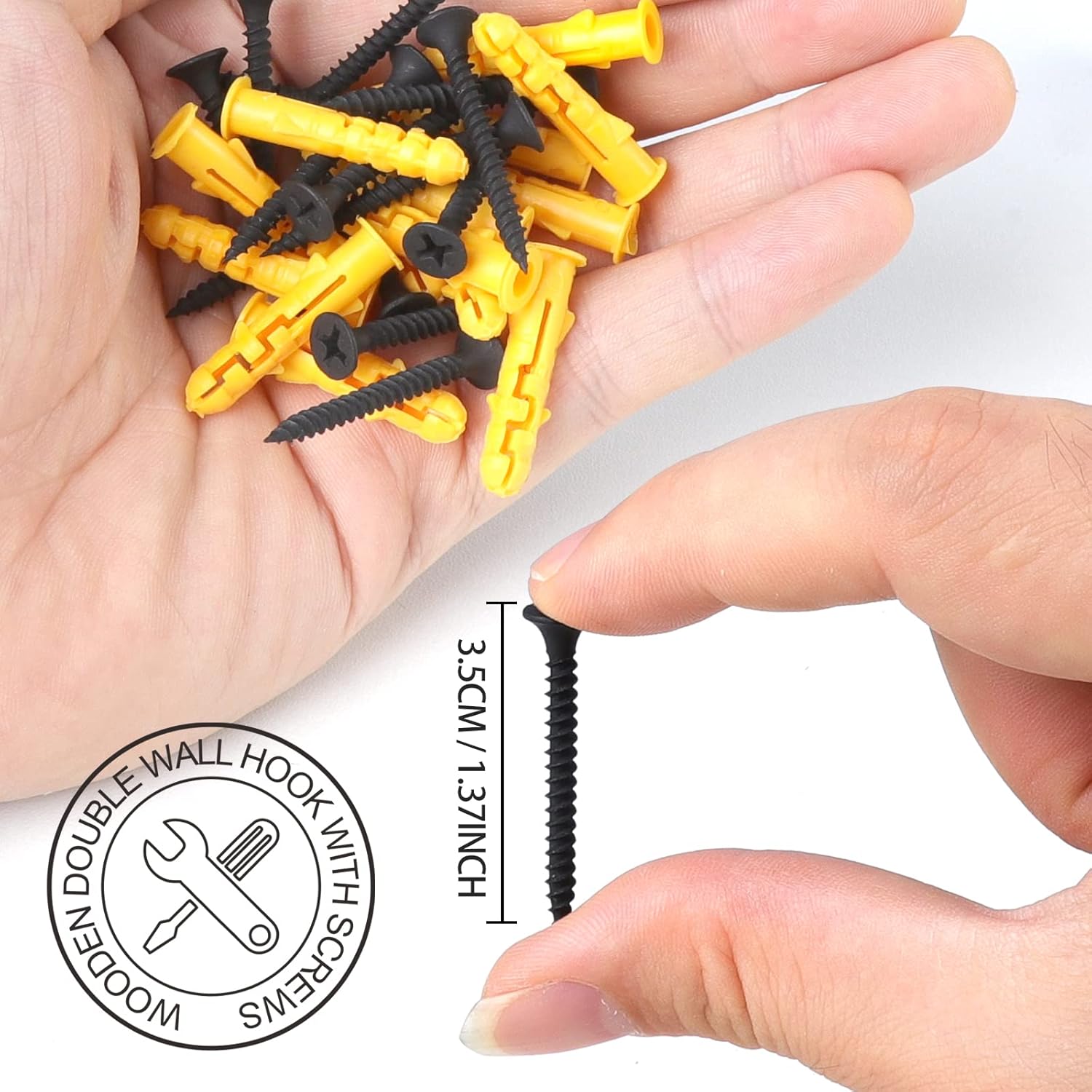 - 6 Pack of Wooden Wall Hooks Package included the 6 hooks, 6 drywall anchors, and 6 black screws. The wooden wall hooks can be mounted freely to hang what you need, like clothes, bags and accessories. Place a single hook on the wall or several in a group to create an organized look!