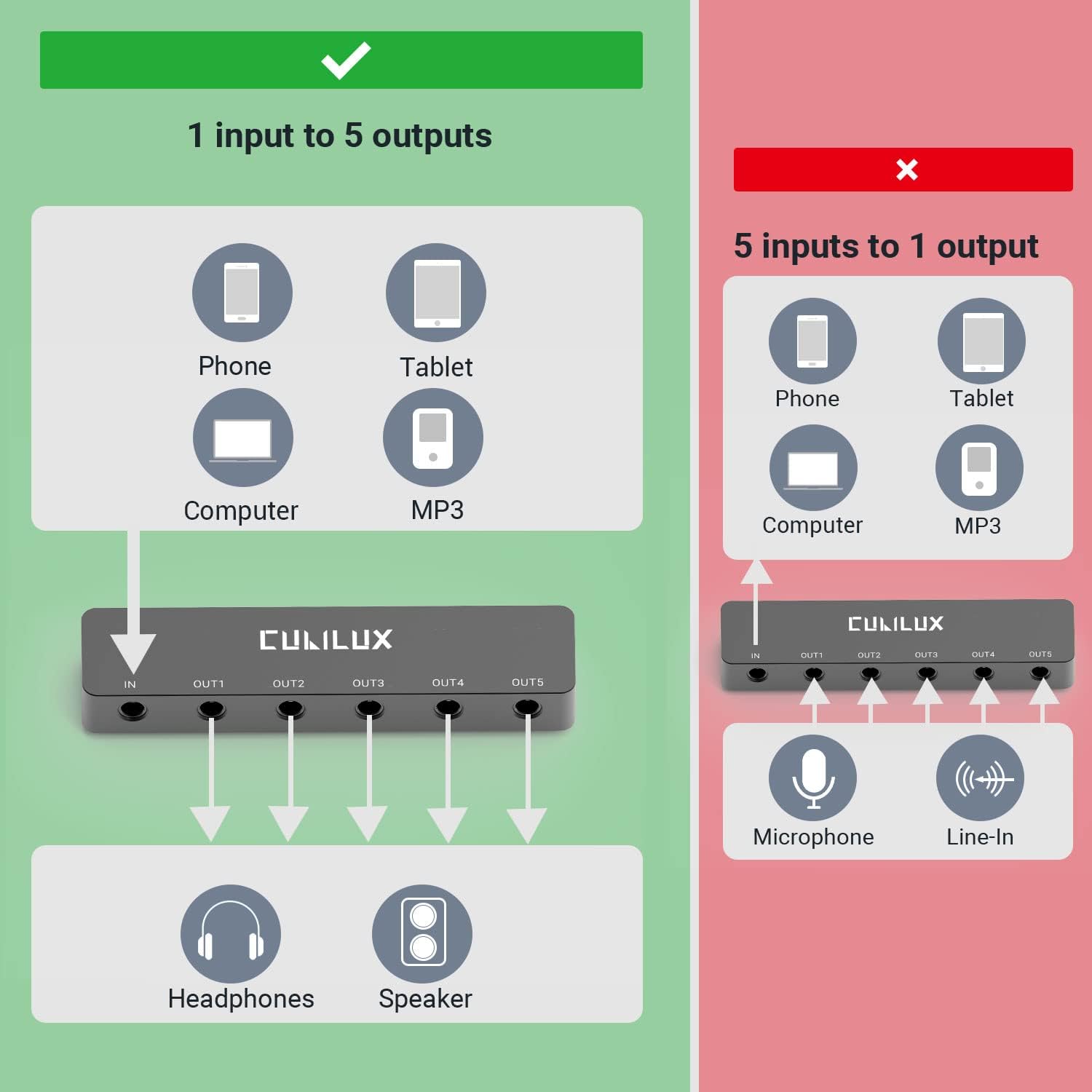 - [5 Ports Headphone Splitter] – Cubilux aux adapter splits audio into 5 x 3.5mm auxiliary ports, letting you to hook up multiple headphones or speaker systems to play music at the same time or easily share music with up to 5 friends.