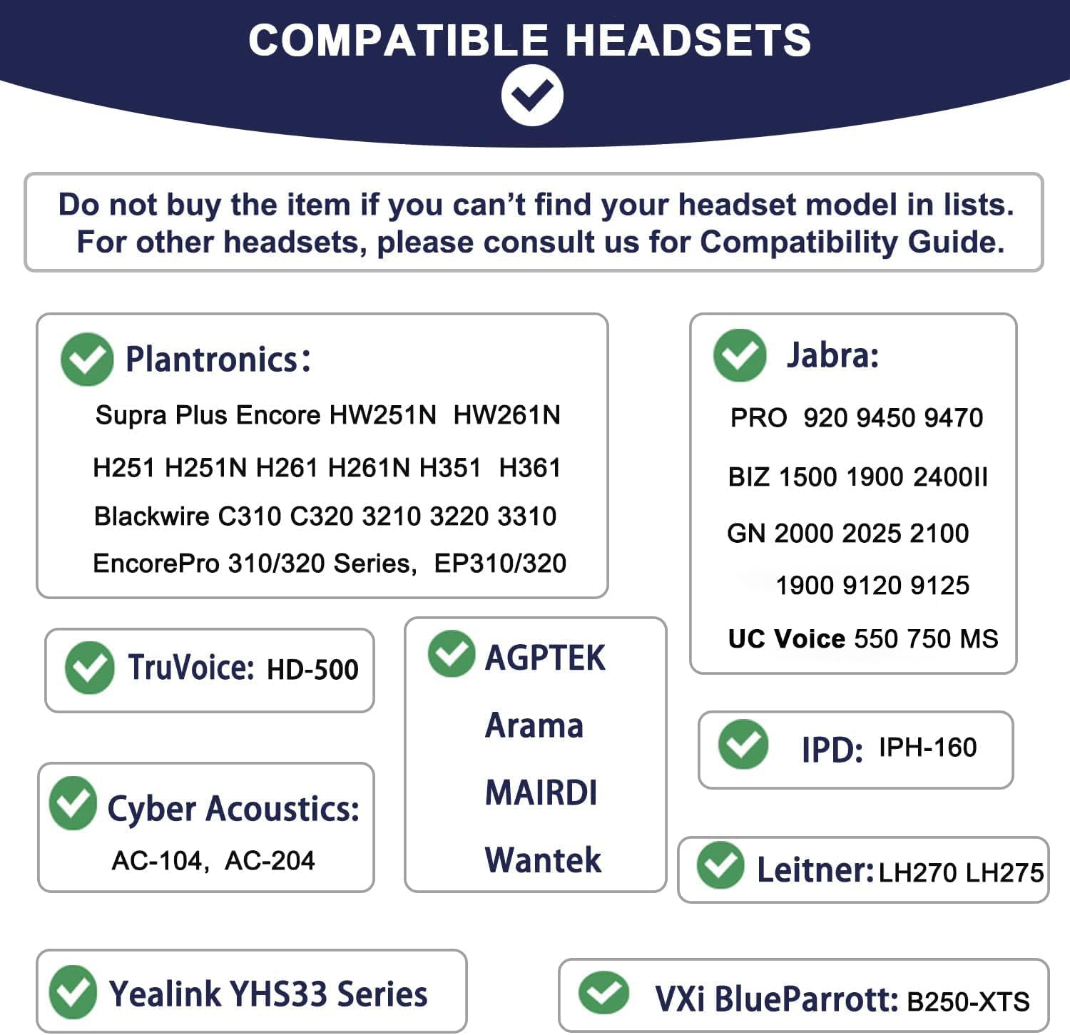 - COMPATIBLE MODELS: NOT for Jabra Evolve 20 30 40 65 75 and Evolve2 Series. ONLY COMPATIBLE WITH SOME SPECIFIC HEADSETS MODELS LISTED IN DESCRIPTION. Some specific models from Plantronics Supra Plus Encore HW251N HW261N HW510 HW520 Blackwire C225 C310 C320 3210 3220 3310 3320 3315 3325 and Jabra PRO 920 930 9450 9460 9465 9470 BIZ 620 1100 1500 1900 2400II GN 1900 2000 2100 2025 9120 9125 UC Voice 550 750, etc. For other headsets, please contact us for Compatibility Guide.