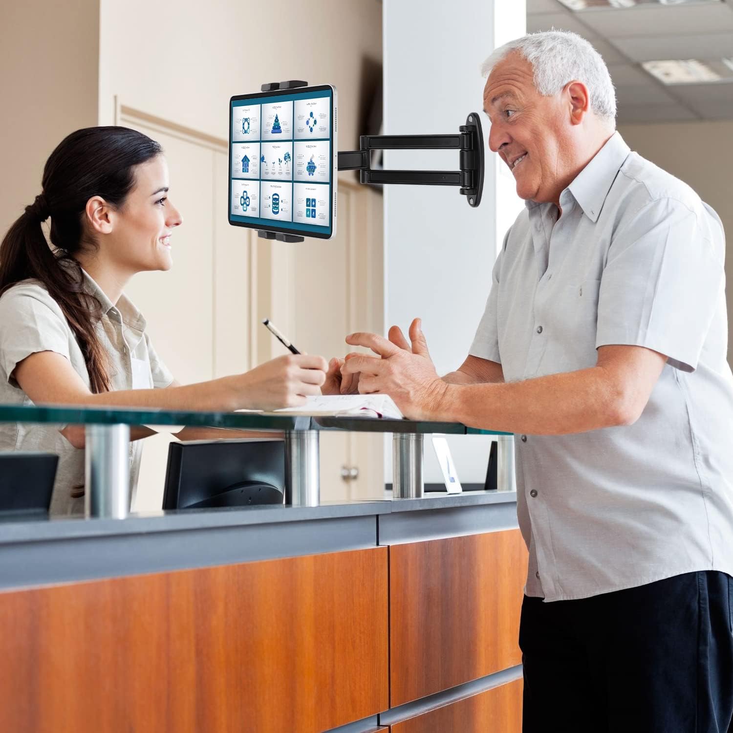 - 【Mount Anywhere】: Heavy-duty aluminum alloy material arm with tablet is suitable for these places: classroom,conference room, warehouse,healthcare facilities,kitchen,office, restaurant,supermarket,gyms,food shop and kiosk etc, the friendly mount arm and clamp are convenience for you.