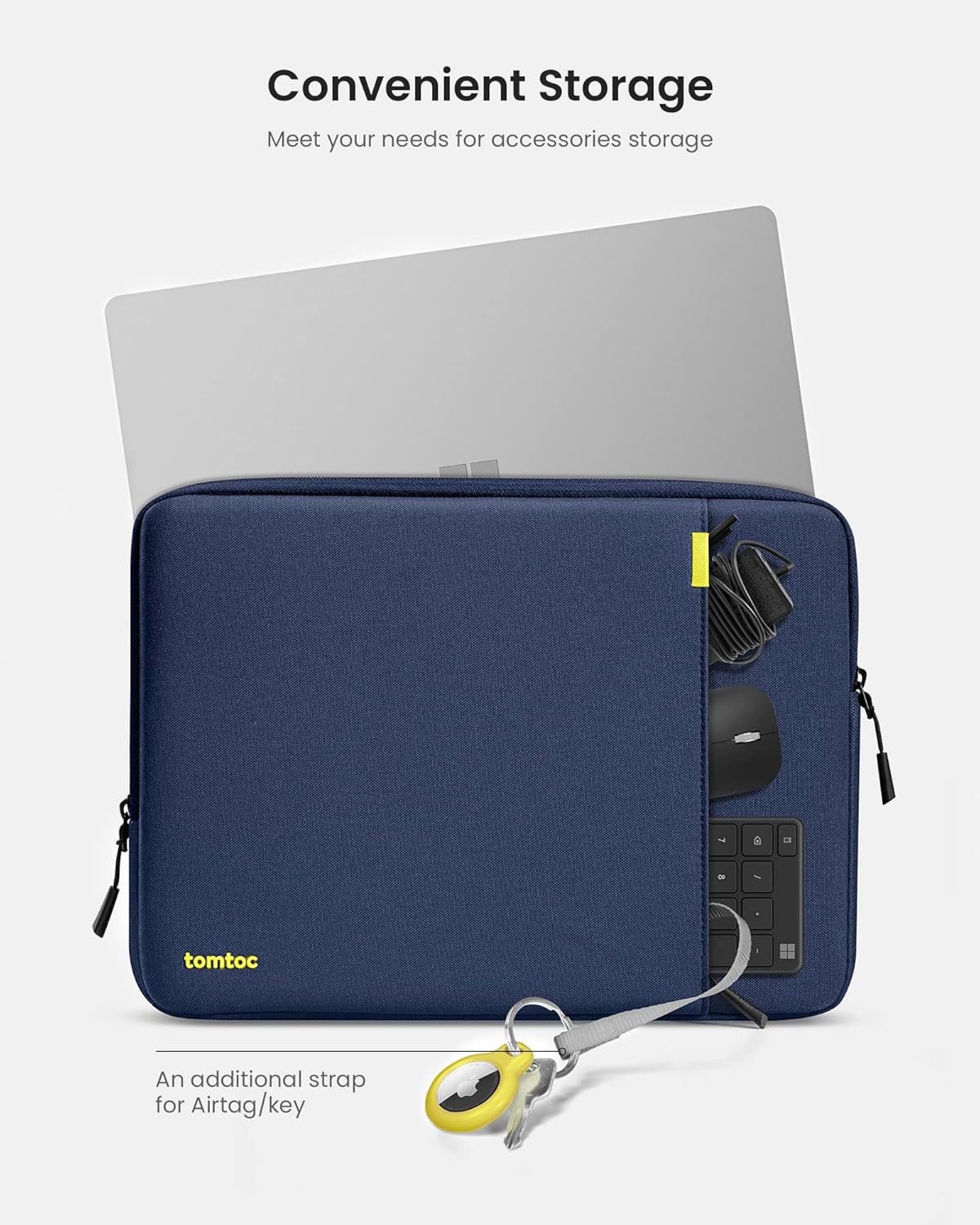- Military-Grade Protection: To combat the toughest situations: from falls to shocks to vibrations, tomtoc proposed the concept of 360 protection and designed the laptop sleeve with CornerArmor Technology, high resilience edges, and high-density soft padding. It passed the Military-Standard-Drop-Test while also maintaining a sleek design