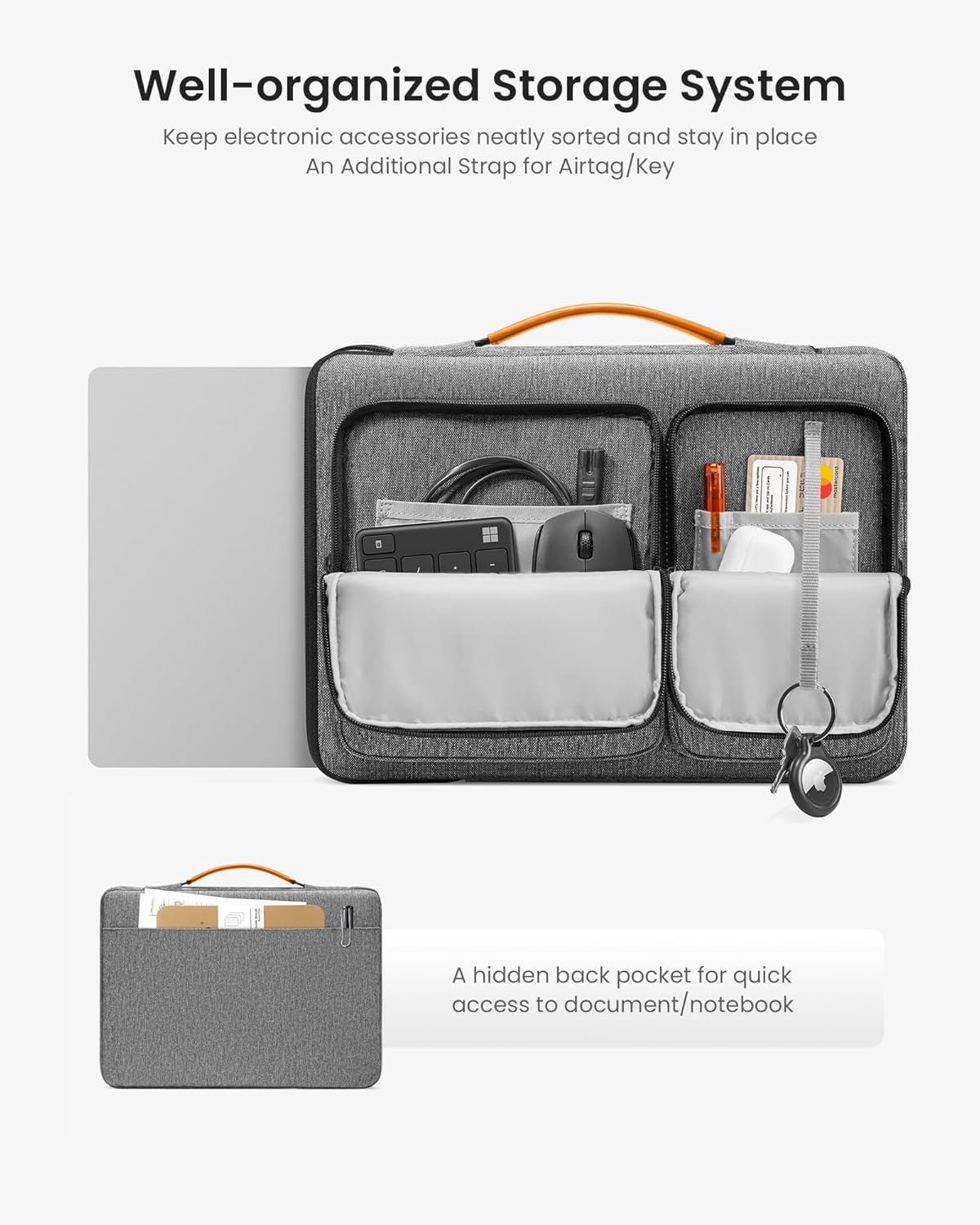 - Smart Tri-compartment Storage System: The laptop carrying case has two separate compartments with several small pockets and a strap for Airtag or key. It can keep your electronic accessories, such as charger, cable, USB hub, Kindle, etc., stay organized. In addition, a hidden pocket on the back allows you to store your personal belongings for easy access while remaining secure