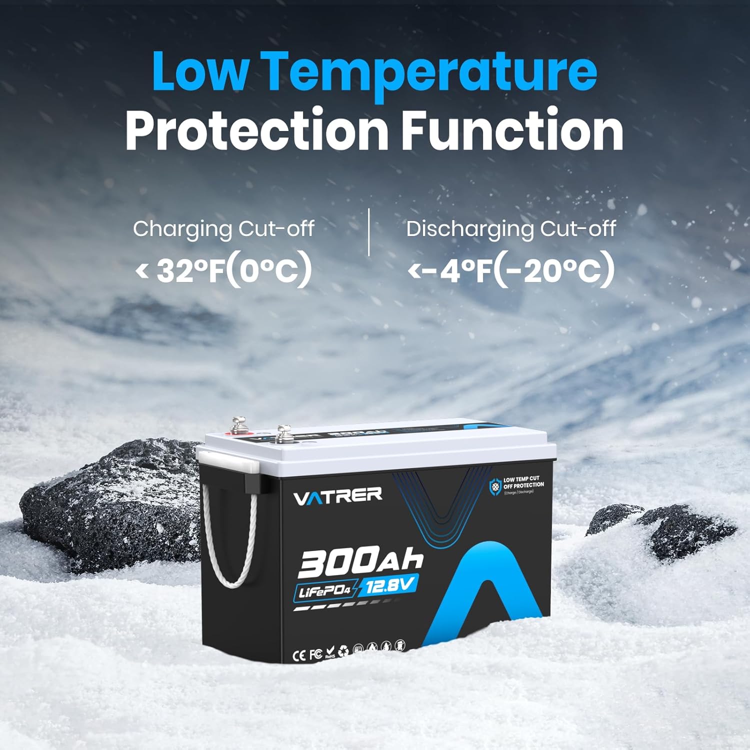 - 【BUILT-IN 200A BMS & Low Temp Cutoff 】 Vatrer Power deep cycle battery has built-in 200A BMS to protect it from overcharge, over-discharge, over-current, and short circuit with excellent low self-discharge rate. With high temp cutting off prevents charging over 167 °F (75°C). And Low temp cutoff protection prevents battery damaged in low temperature environment.