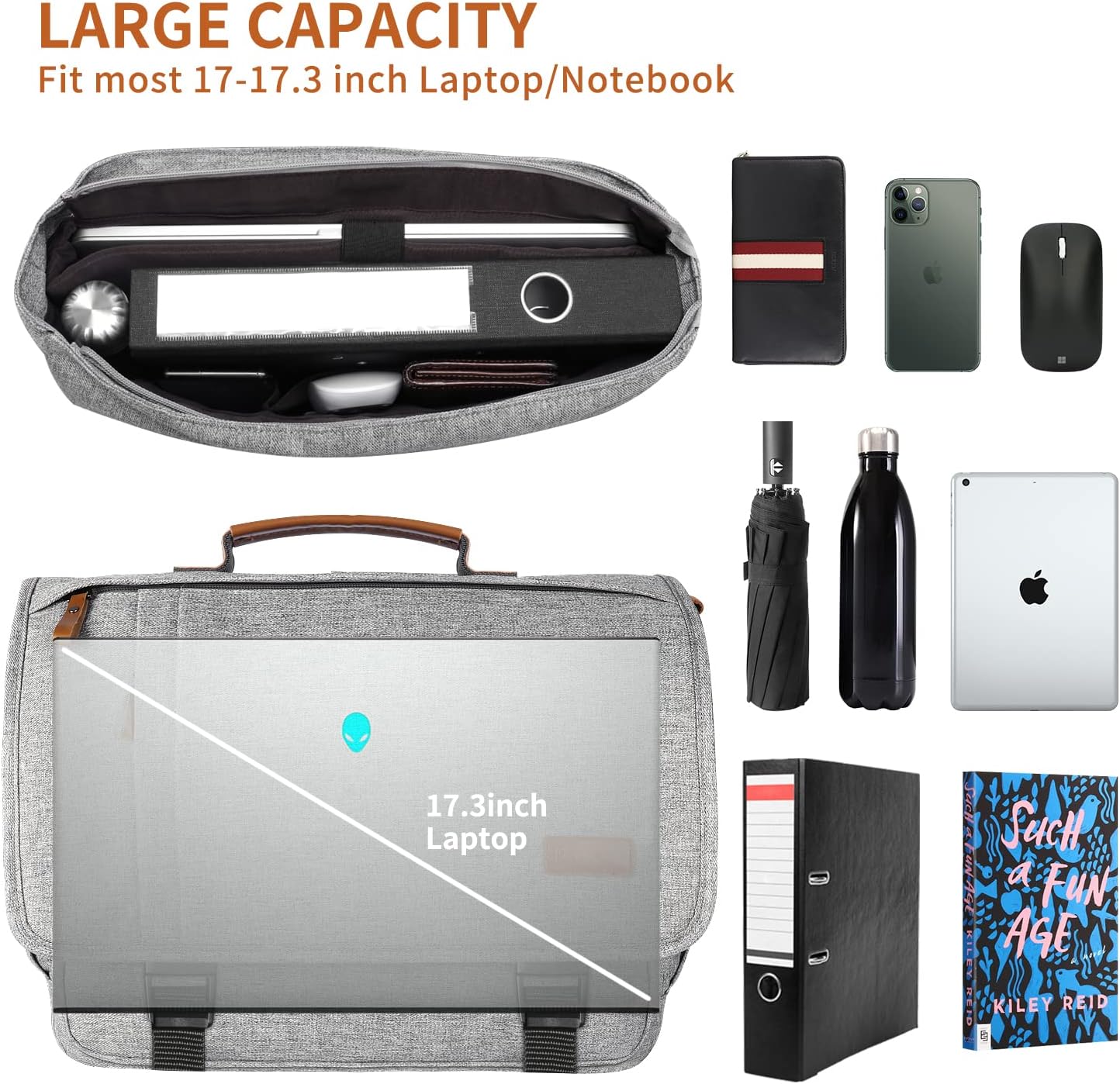 - LARGE MAIN COMPARTMENT: With zip closure, the laptop bag could fit documents, 3 inch binder etc. Separated padded laptop compartment fit for 17" -17.3" Laptop / Notebook. Not fit for larger computer. Messenger Bag Max Dimensions: 18.5 x 13.78 x 5.91 inch. Weight: 2.67 LBS. Please measure your laptop before order.