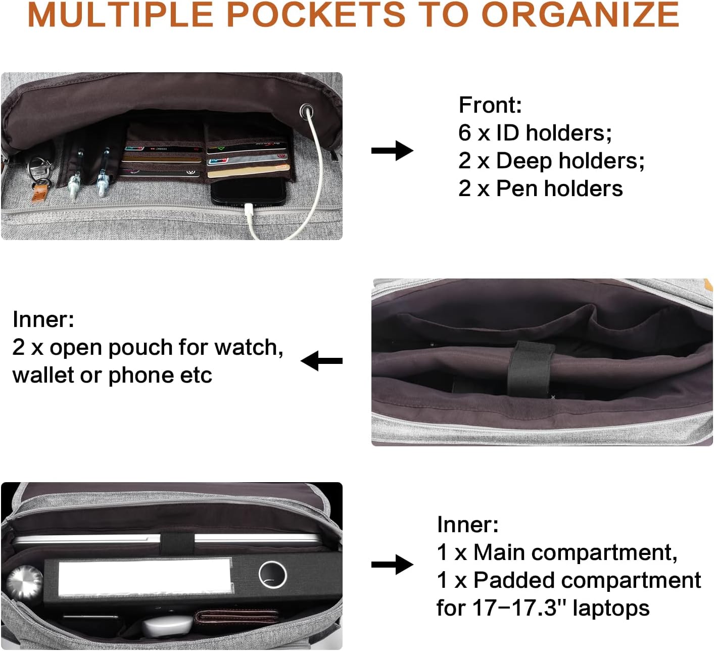 - ROOMY ORGANIZED POCKETS: Perfectly designed with various practical pockets: FRONT : 2 x Zipper pockets on the flap; 1 x Zipper oranizer under the flap: 6 x ID holders; 2 x Deep holders; 2 x Pen holders. SIDE: 2 x Side pockets. INNER: 1 x Main compartment, 1 x Padded compartment for 17-17.3 inch laptops; 2 x Inner open pouch Back: 1 x Rear zipper pocket.