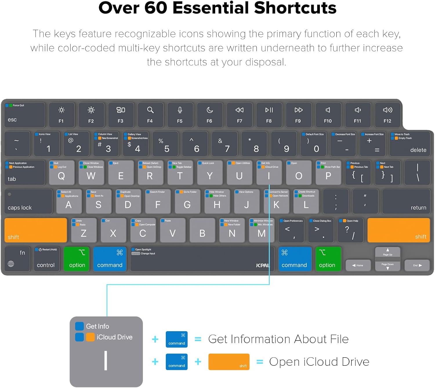 - Improve your efficiency with a MacBook keyboard cover featuring up to 2 color-coded multi-key shortcuts for the Mac Operating System printed on each key.
