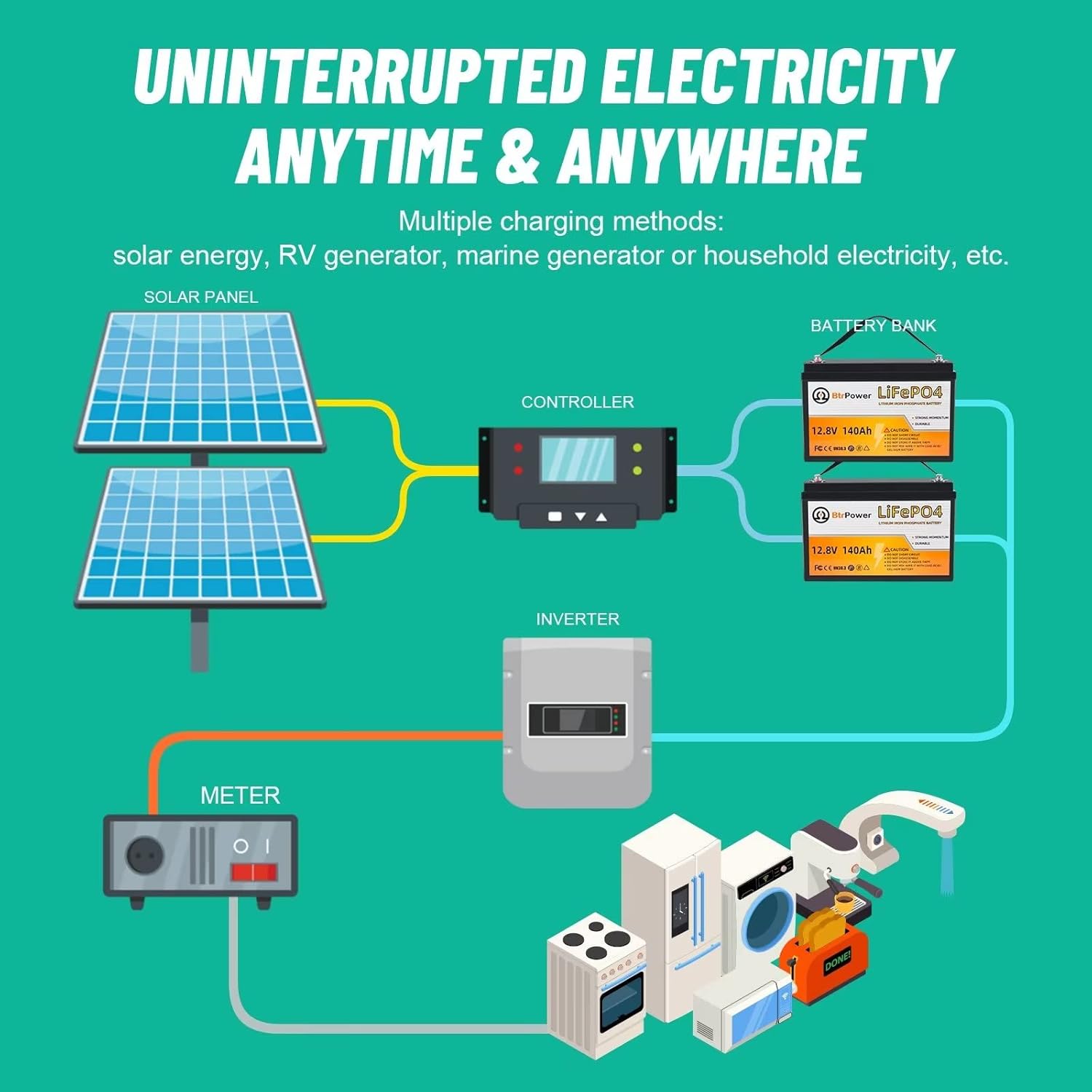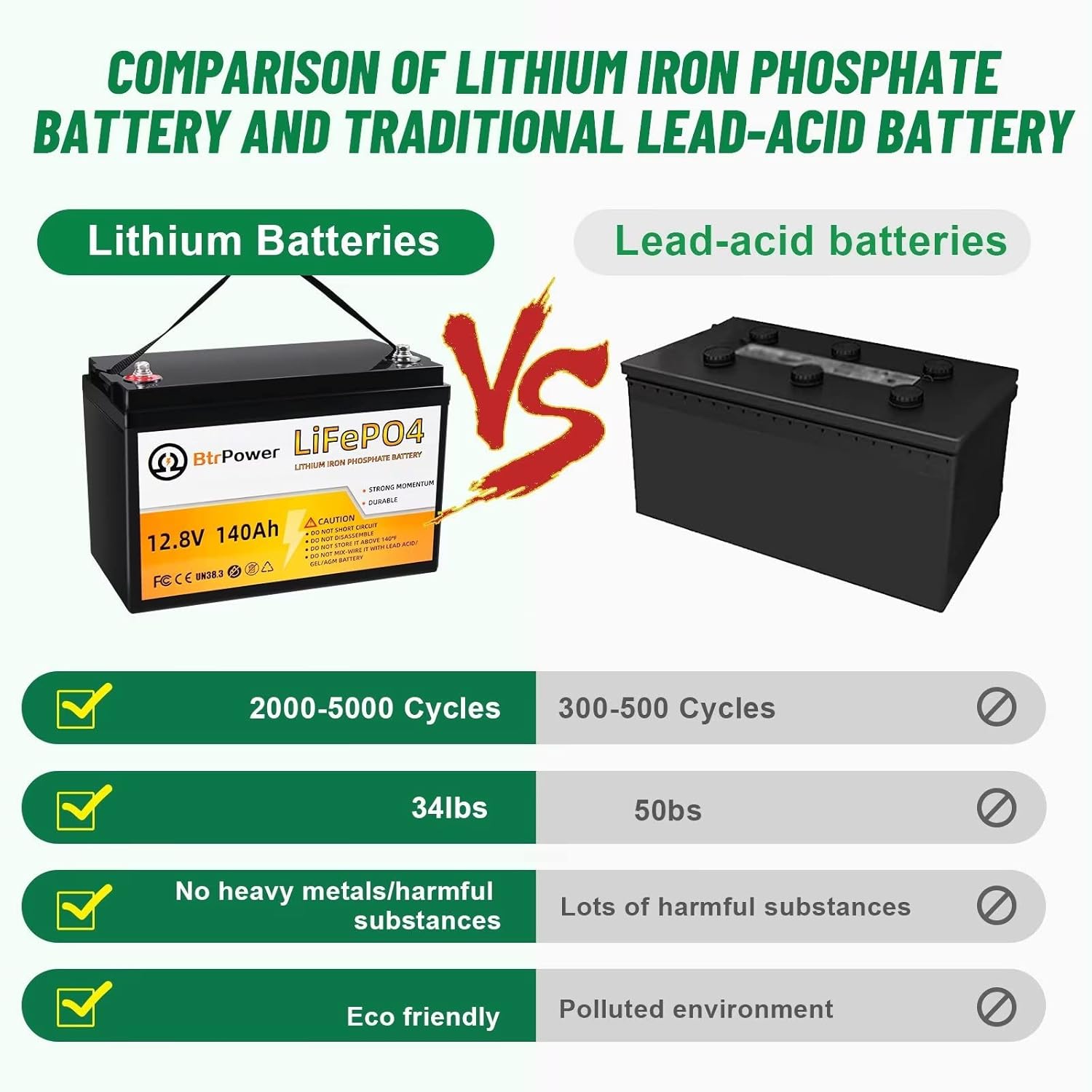 - 【100A BMS Board】Our 12v 140ah LiFePO4 battery has built-in 100A BMS (Battery Management System) to protect it from overcharge, over-discharge, over-current, and short circuit with excellent self-discharge rate. 12v lithium batteries are safer than Lead Acid batteries.