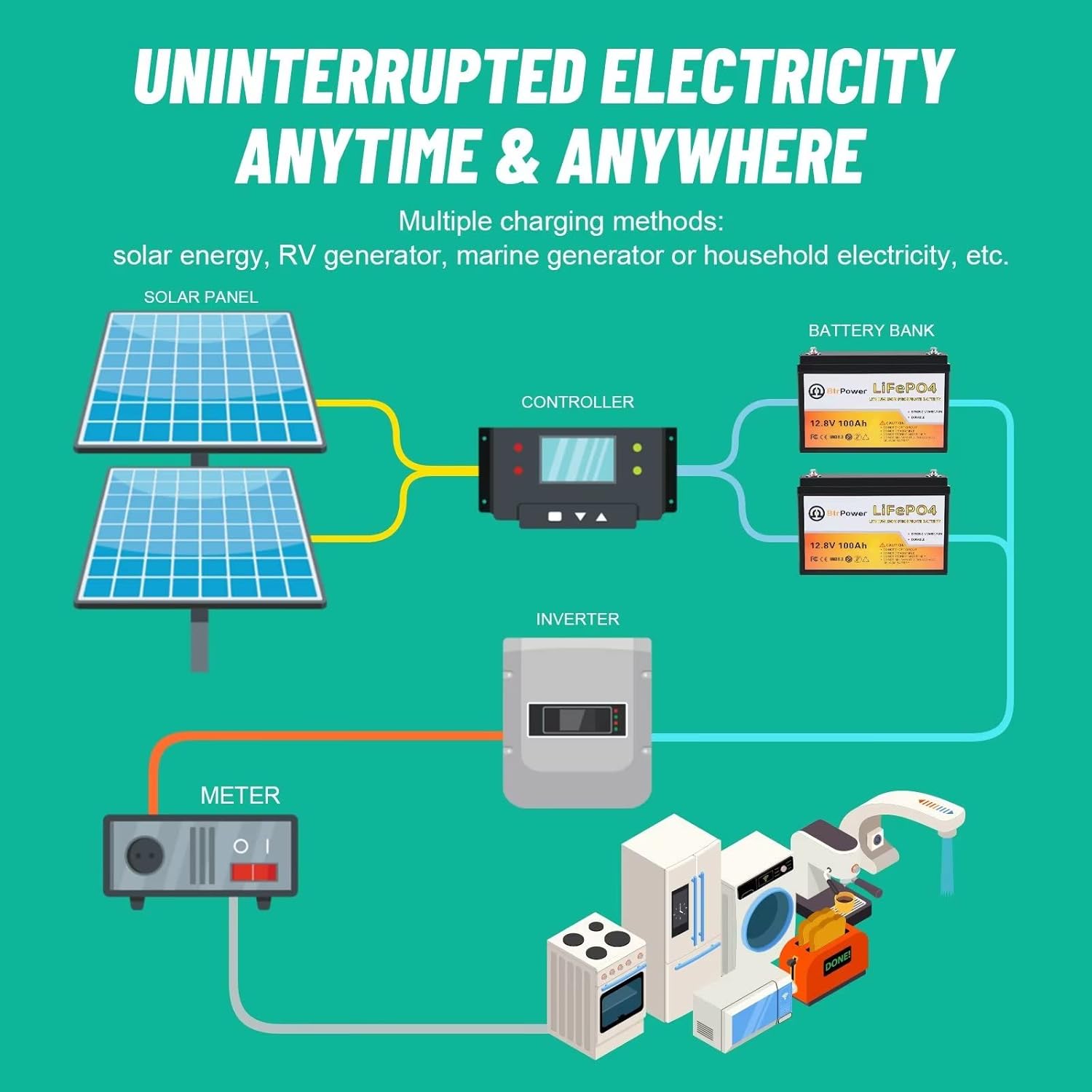 - 【Professional BMS Board】Our 12v LiFePO4 battery has built-in 100A BMS (Battery Management System) to protect it from overcharge, over-discharge, over-current, and short circuit with excellent self-discharge rate. 12v lithium batteries are safer than Lead Acid batteries.