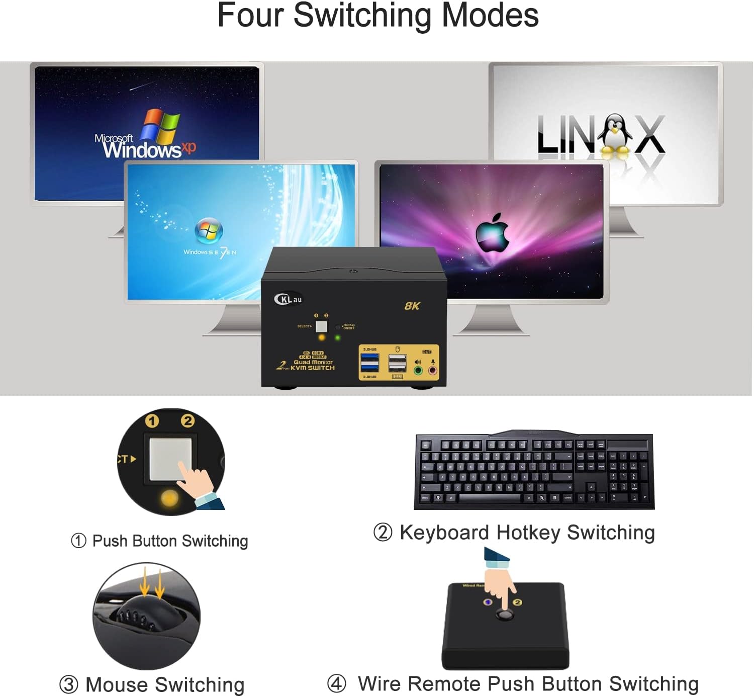 - 4. 4 Monitors HDMI KVM Switch 2 Port: Resolution compatible 10240x4320@60Hz, 7680x4320@60Hz, 5120x2880@50/60Hz, 4096x2160@50/60/100/120Hz,3840x2160@60/120/144Hz,3840x1620@60/120/144Hz,3440x1600@60/120/144Hz,3440x1440@60/120/144Hz,3840x1080@60/120/144/165/240Hz, 3200x1800@60/120/144/165/240Hz, 2560x1440@60/120/144/165/240Hz, 2048x1536@60/120/144/165/240Hz, 2048x1280@60/120/144/165/240Hz, 2048x1080@60/120/144/165/240Hz, 1920x1200@60/120/144/165/240Hz, etc.