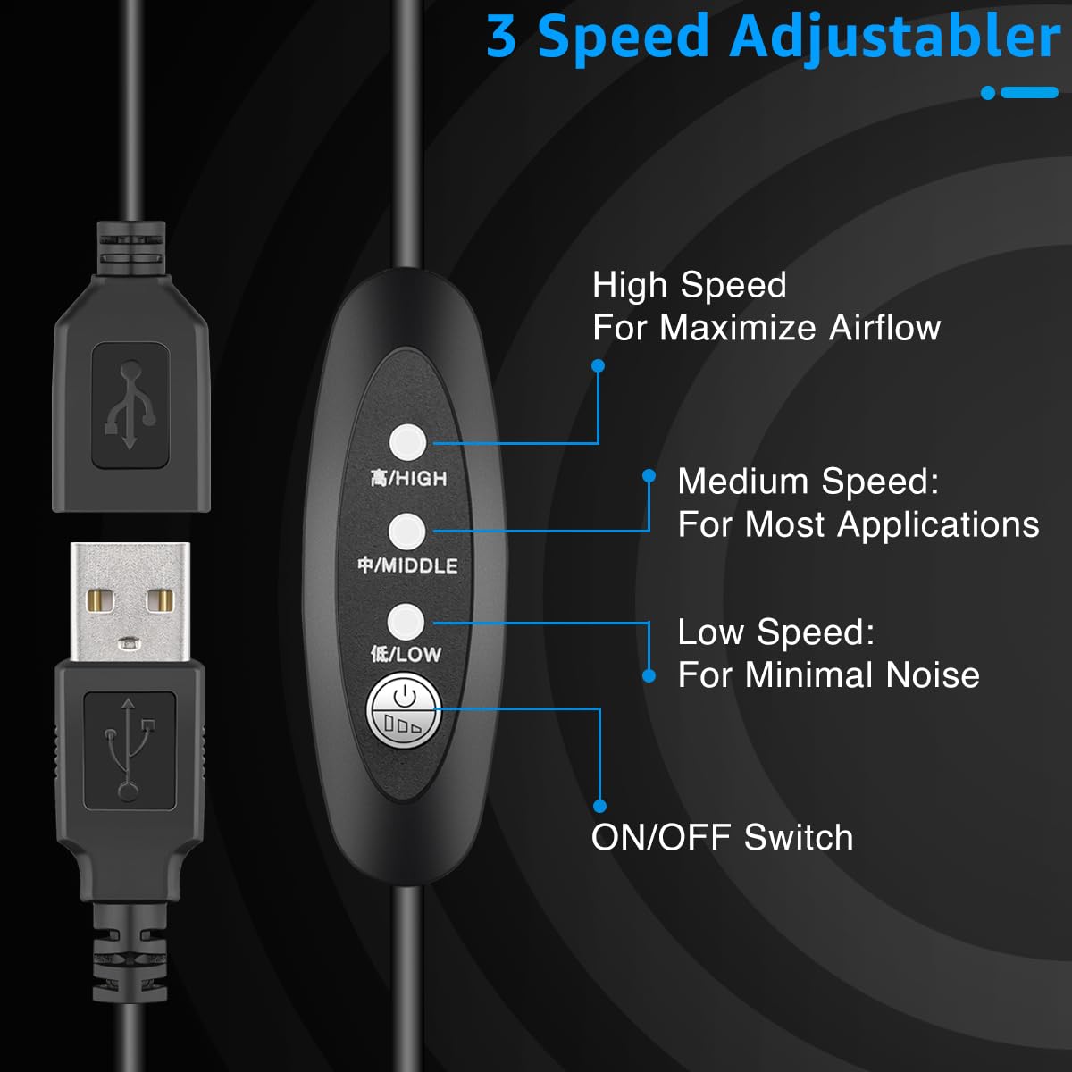 - 3-Speed Adjustable: The fan includes a 3.5ft multi-speed controller with power switch to set the fan's speed to optimal noise and airflow levels for various environments