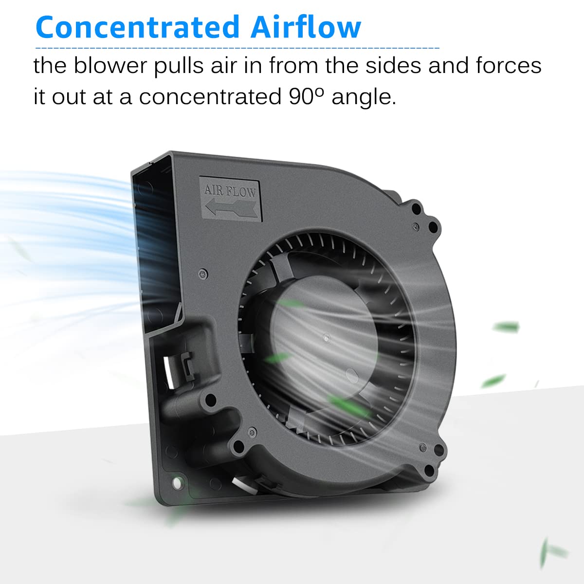 - Efficient Cooling: This 120mm blower cooling fan has a more concentrated airflow in which the equipment pulls air in from the sides and forces it out at a concentrated 90 angle; Low profile design blower can use on components which have vents on the top or sides