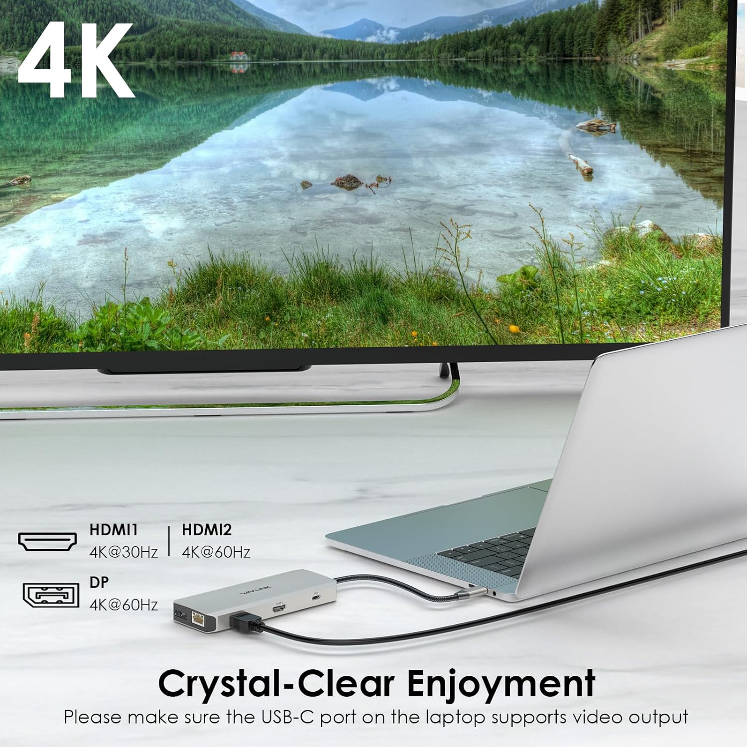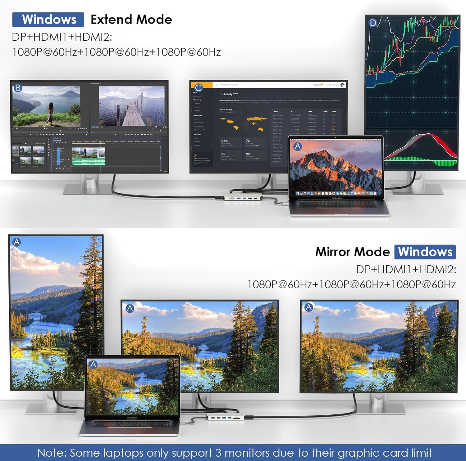 - Triple Display USB C Dock: Only Windows OS supports the Triple display, Mac OS is not supported, you use it to connect macbooks, it only support mirror mode without triple display. Under DP1.4 source, USB-C docking station with HDMI 1 up to 4k@60Hz, HDMI 2 up to 4k@30Hz, DisplayPort up to 4k@60Hz high-definition video output ports. When dual or triple display resolution is 2K@60Hz. Under extended mode, you can have 4 multiple displays, 2 HDMI outputs, a DP output and a laptop screen