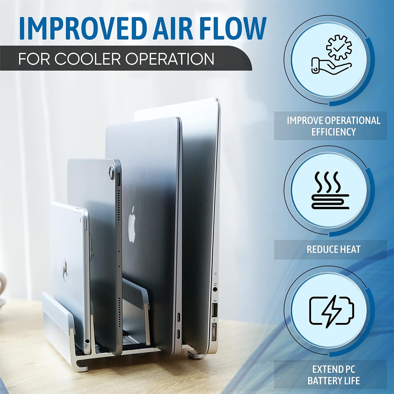 - Modern Design: Optimize your desk with an aluminum finish vertical laptop stand: cradle and hold your laptop or MacBooks, and mobile devices in style. Save valuable desk space, protect your device from spills, and provide better cooling with a vertical laptop holder.