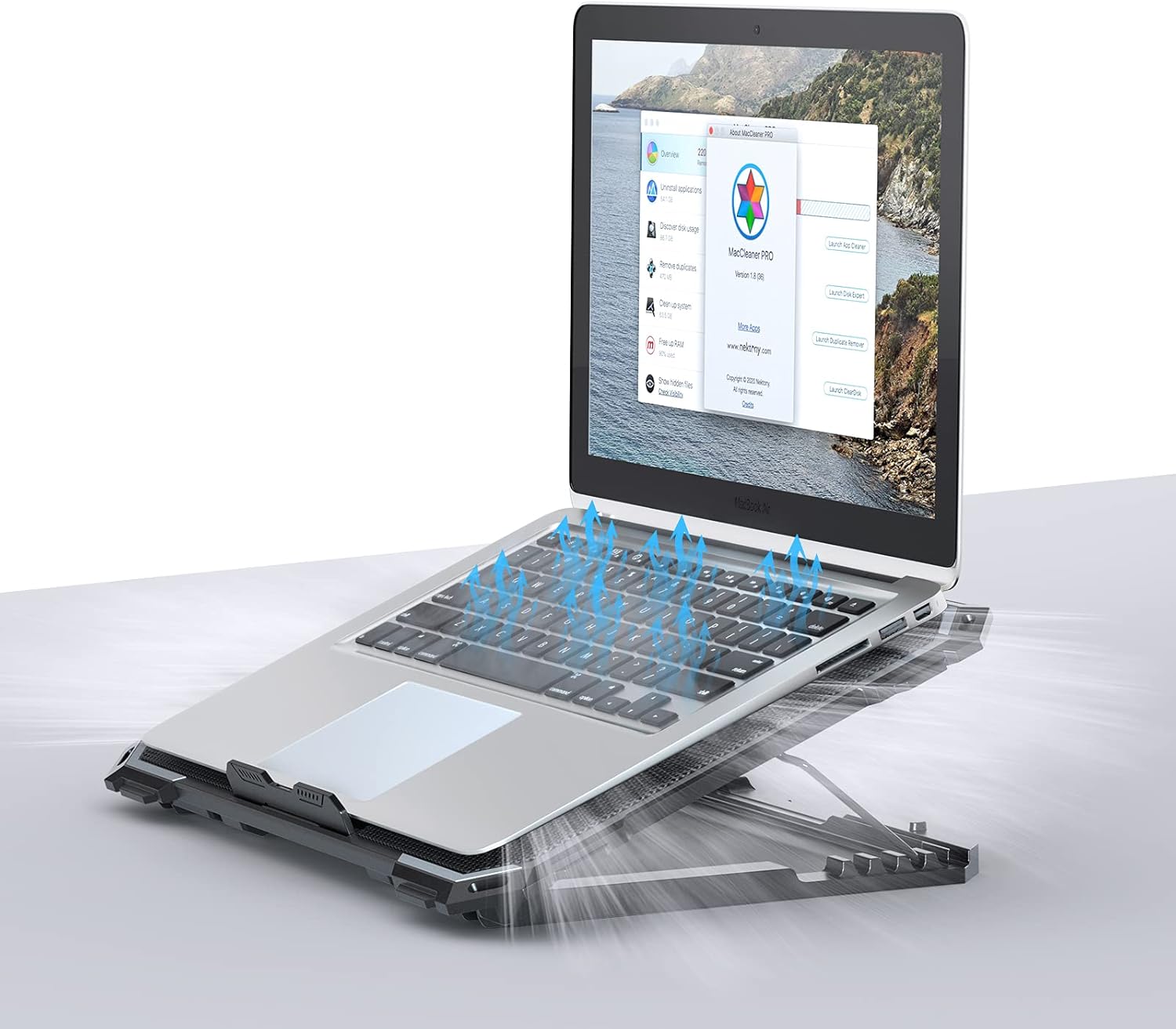 - 【Ergonomic Laptop Cooling Stand】This laptop fan cooling pad has 5 adjustable height settings to put the stand up or flat and hold your laptop in a suitable position. Baffle prevents your laptop from sliding down or falling off; It's not just a laptop Cooling Pad, but also a perfect laptop stand.