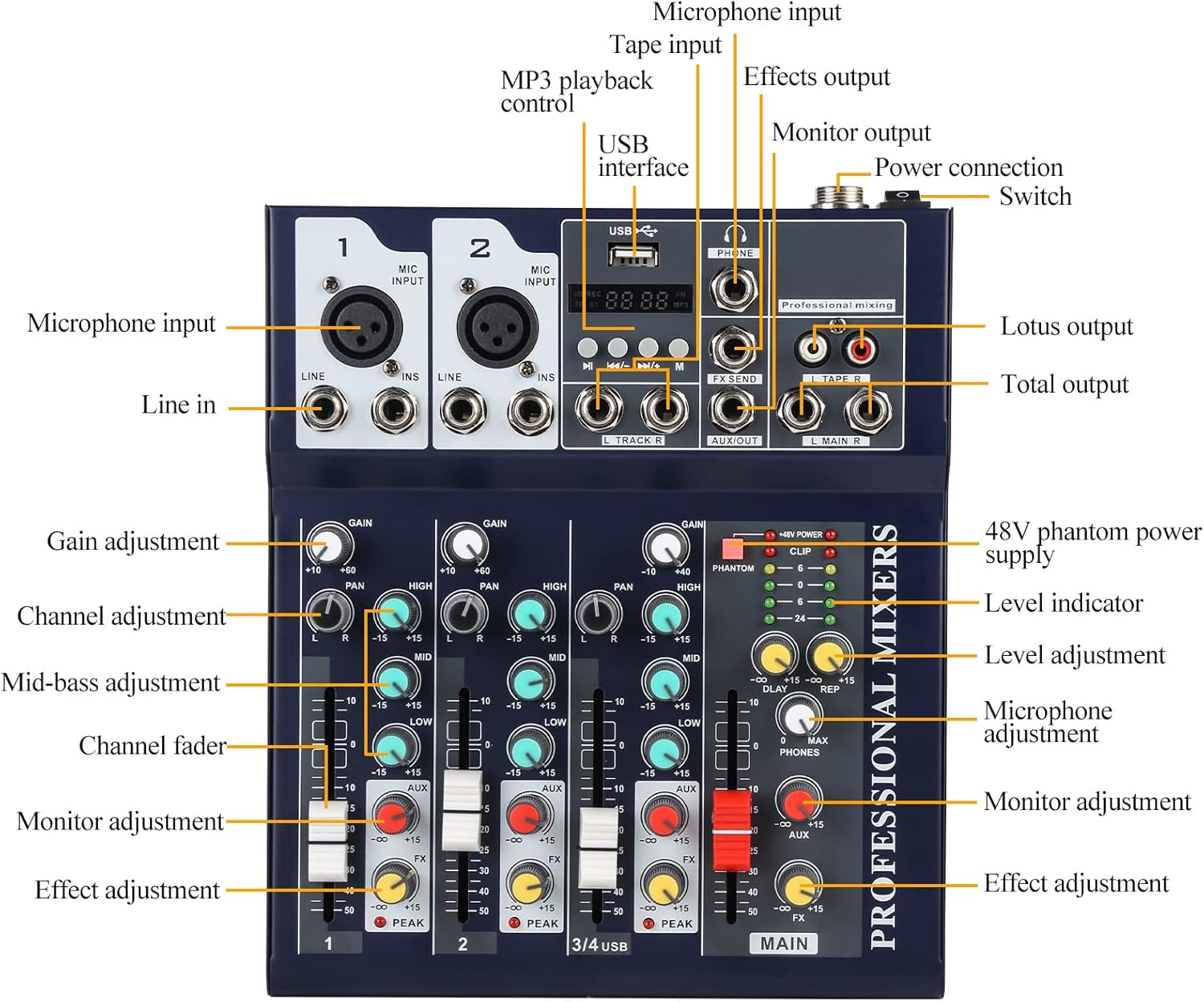 - [Multi-interface mode desktop] audio mixer supports headphone, instrument, MIC, line, xlr or unbalanced 1/4" plug interface input, 48V phantom power supply, to meet the needs of various input devices.