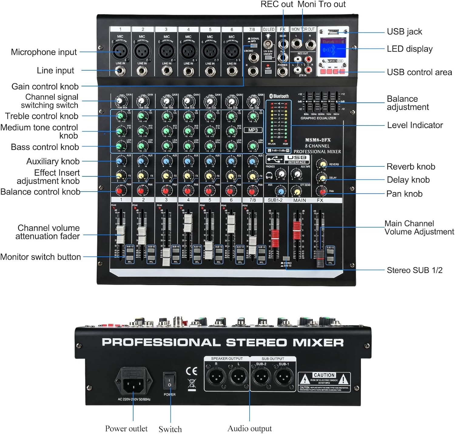 - This professional 8-channel tuner microphone single-channel 3-band equalization adjustment, 5-band master equalization adjustment, 8-channel input, stereo main output, 2-channel SUB group output, and high-precision faders provide better tone adjustment control.
