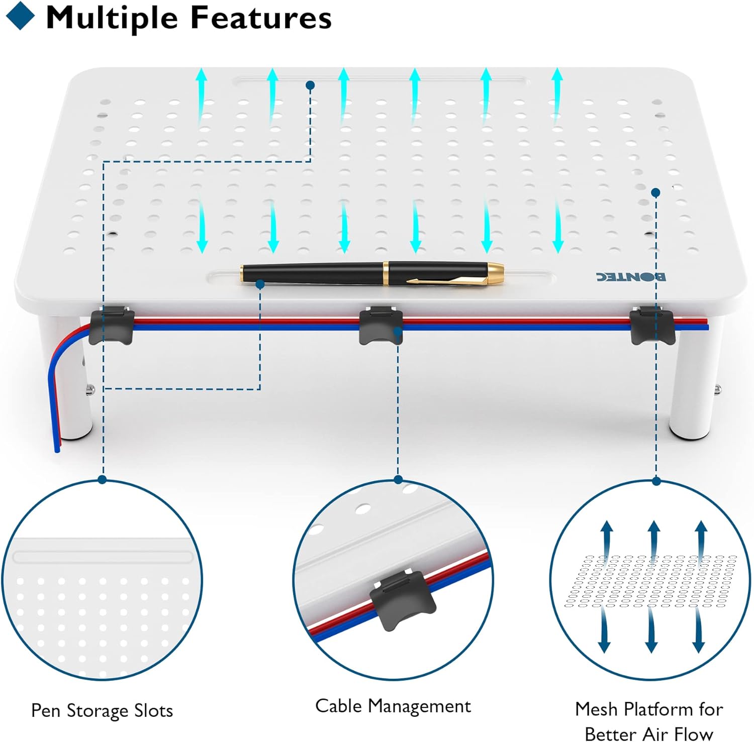 - PREVENTS OVERHEATING WITH MESH PLATFORM - The ventilated design improves airflow, reducing the risk of overheating for your devices. The compact 14.5” x 9.1” platform provides extra space underneath for storing keyboards, phones, or notebooks